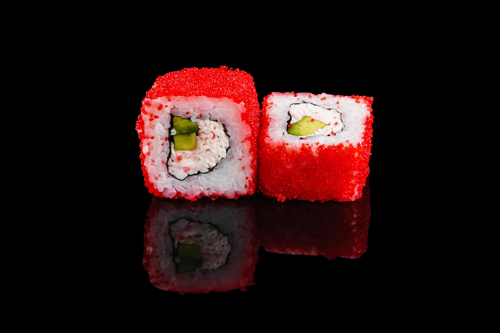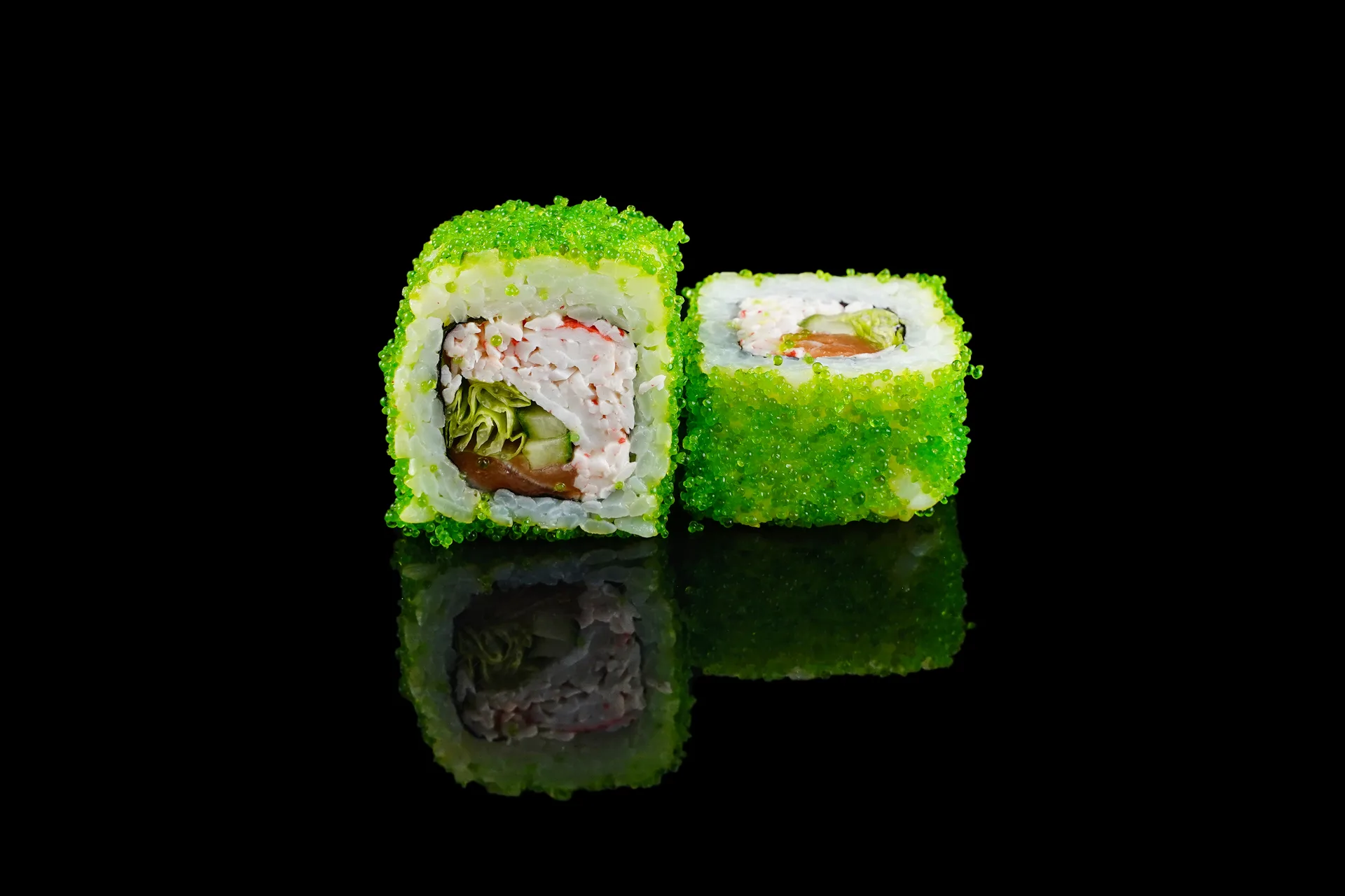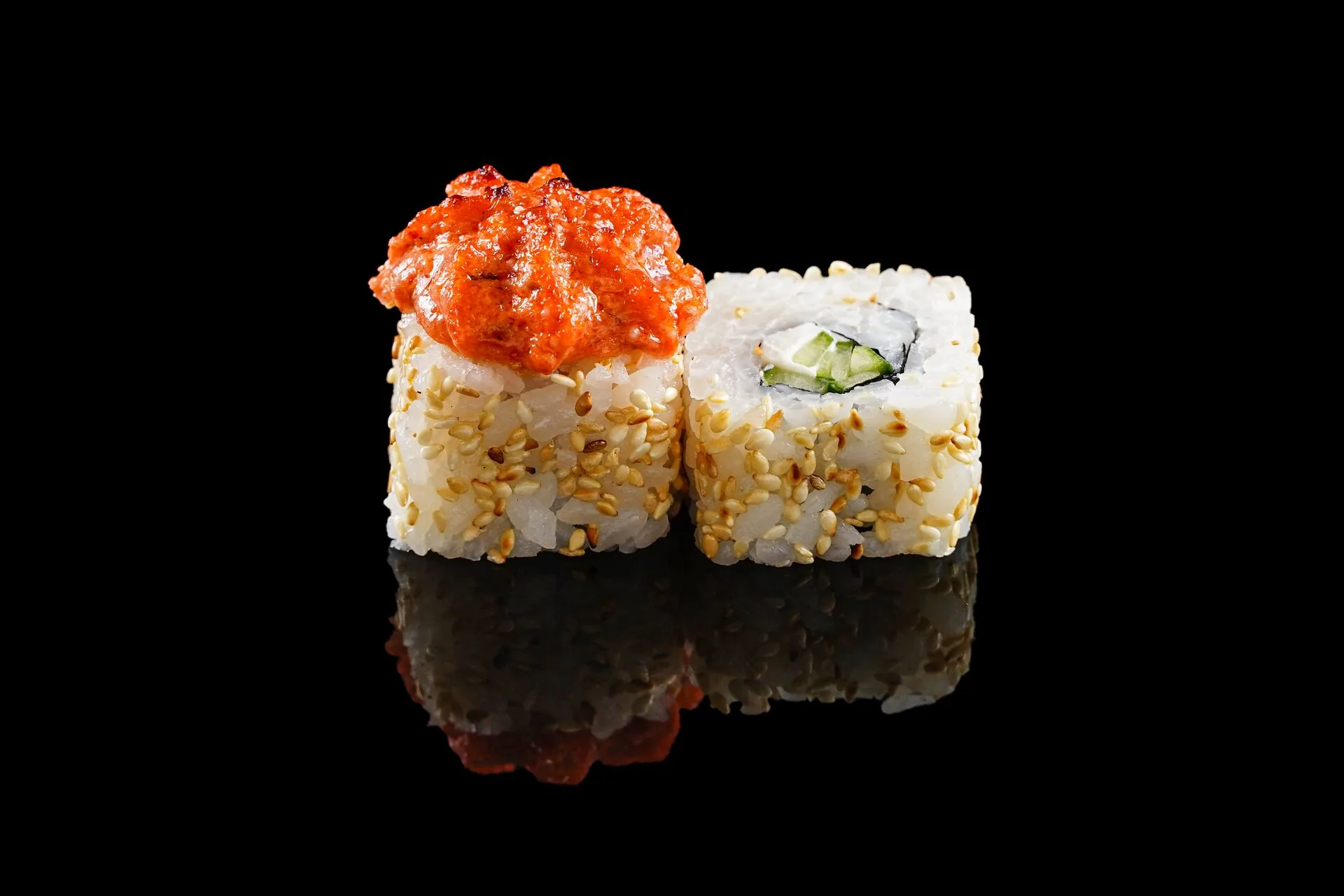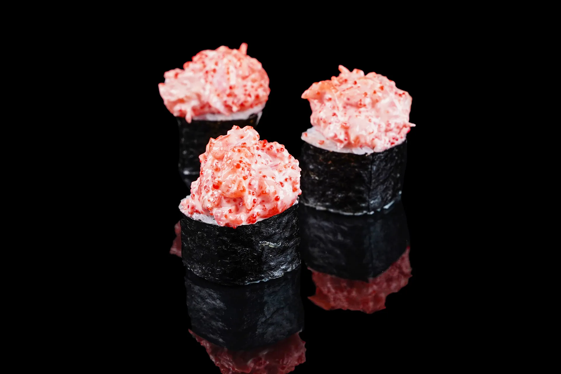 Лосось, гребешок, икра Тобико, огурец, майонез.