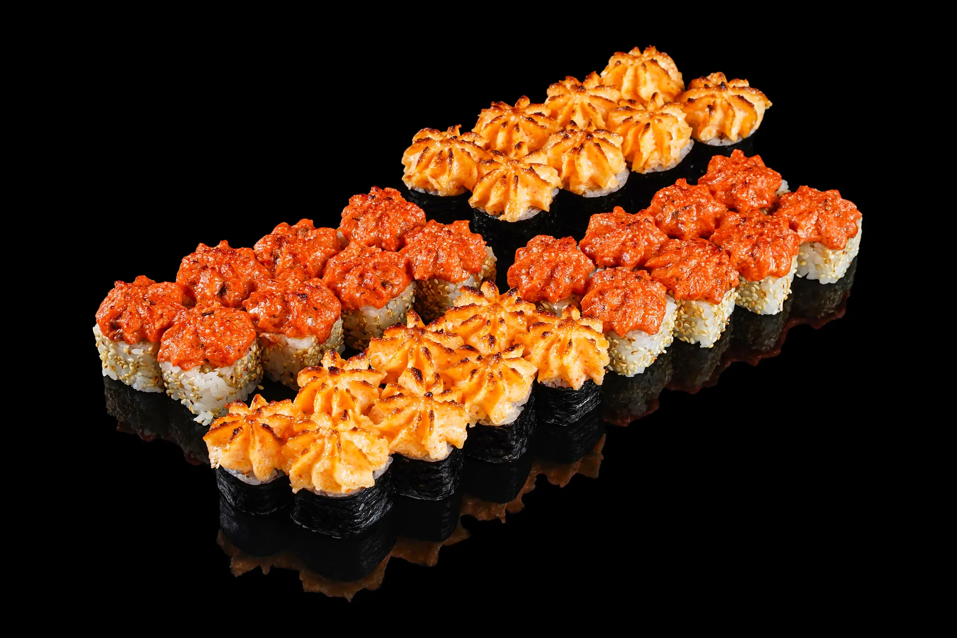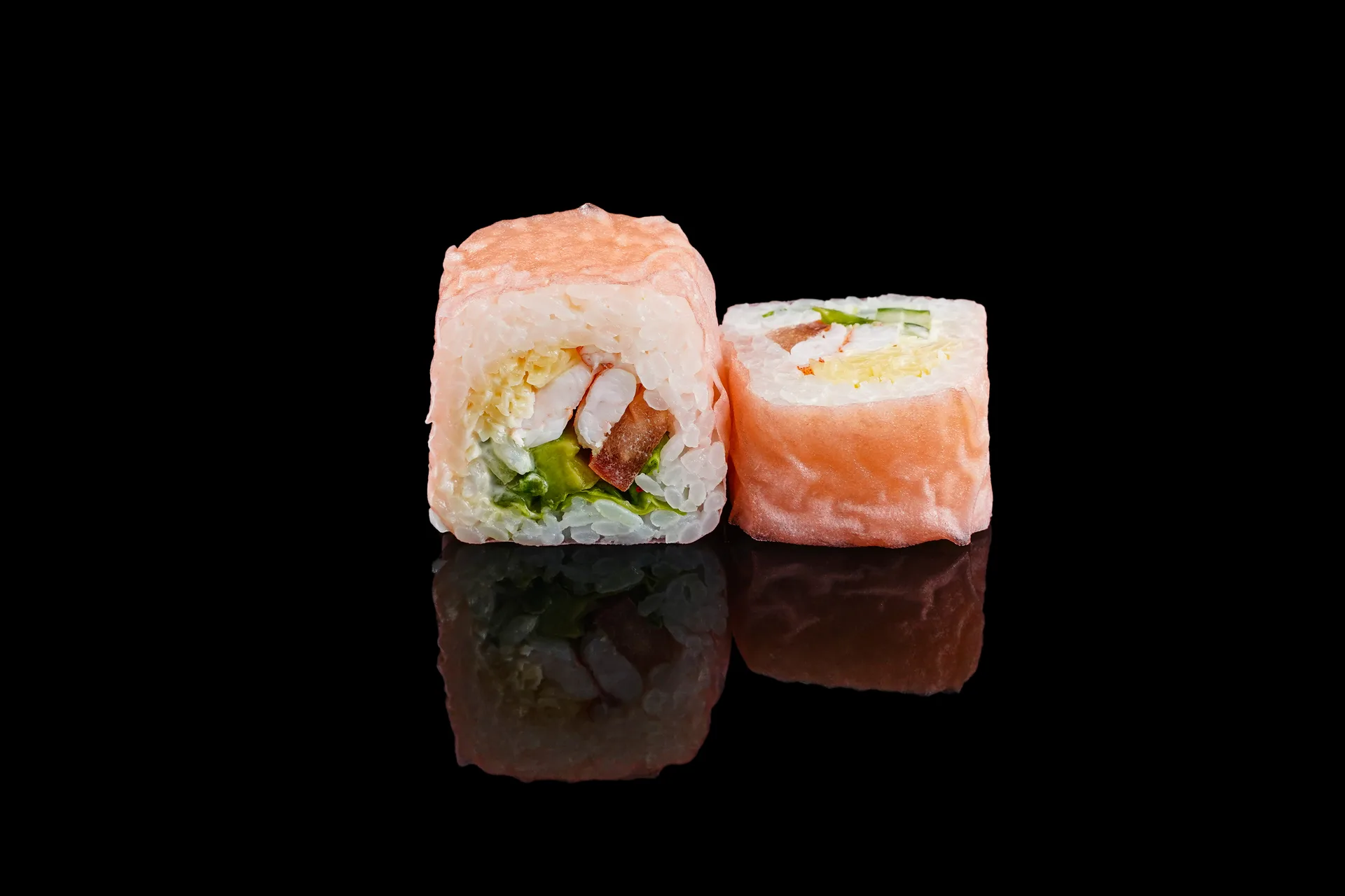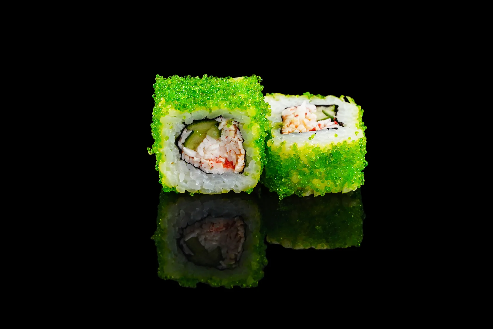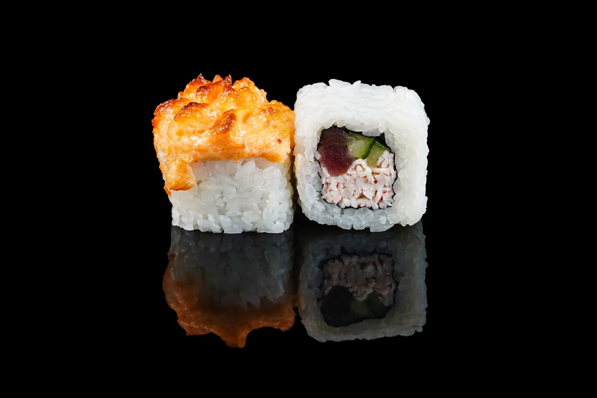 Лосось, гребешок, икра Тобико, огурец, майонез.