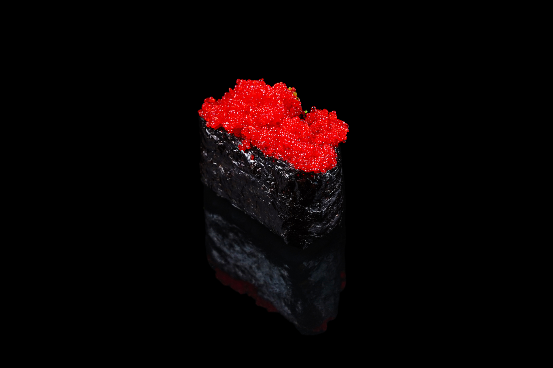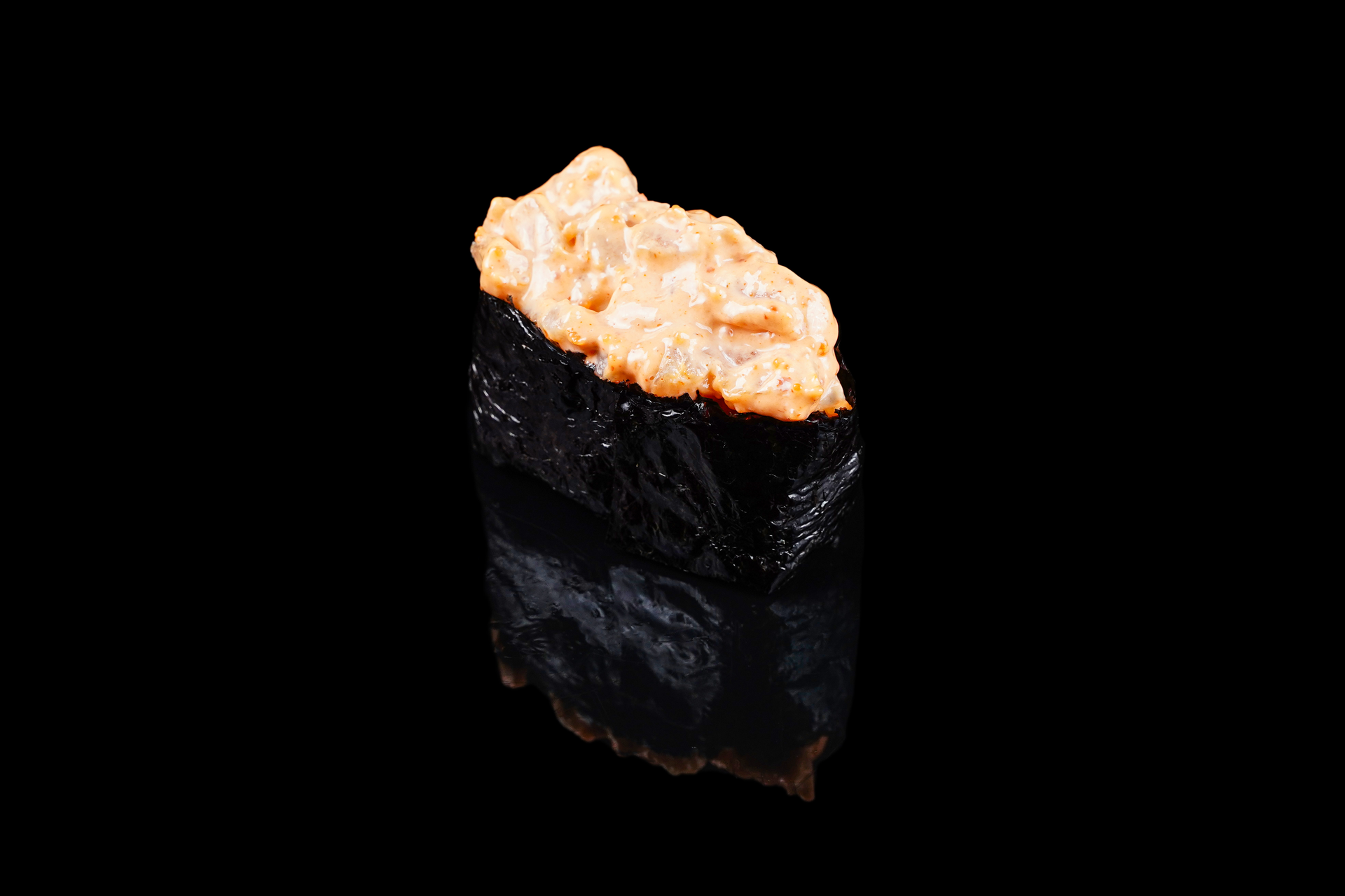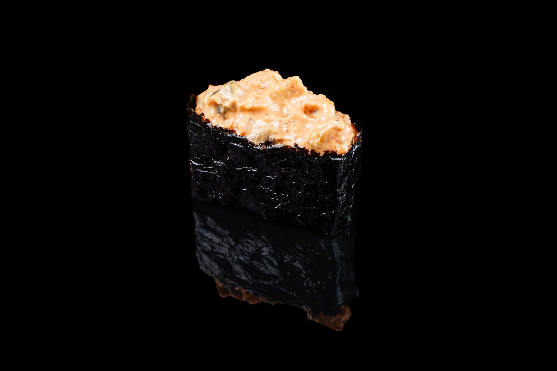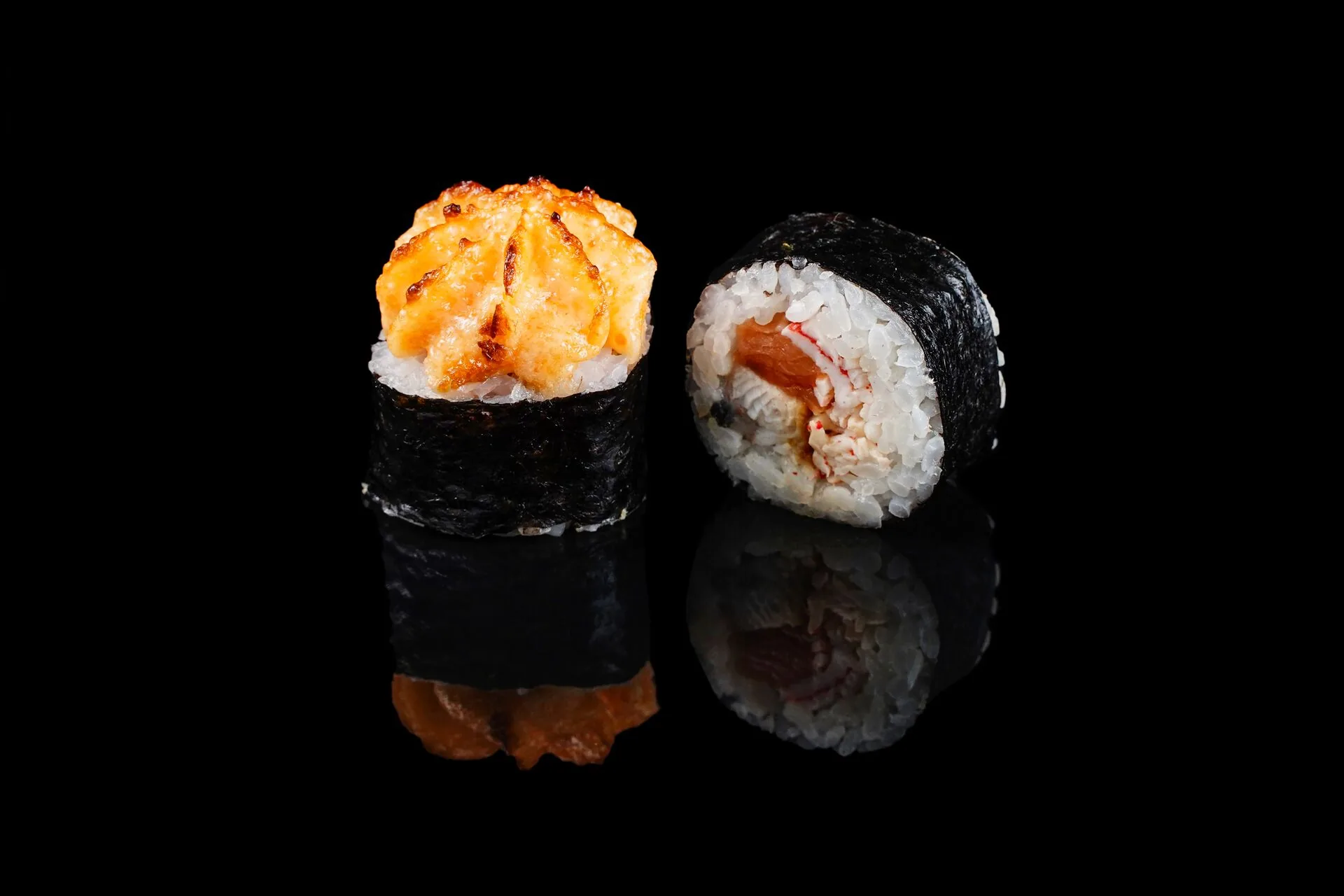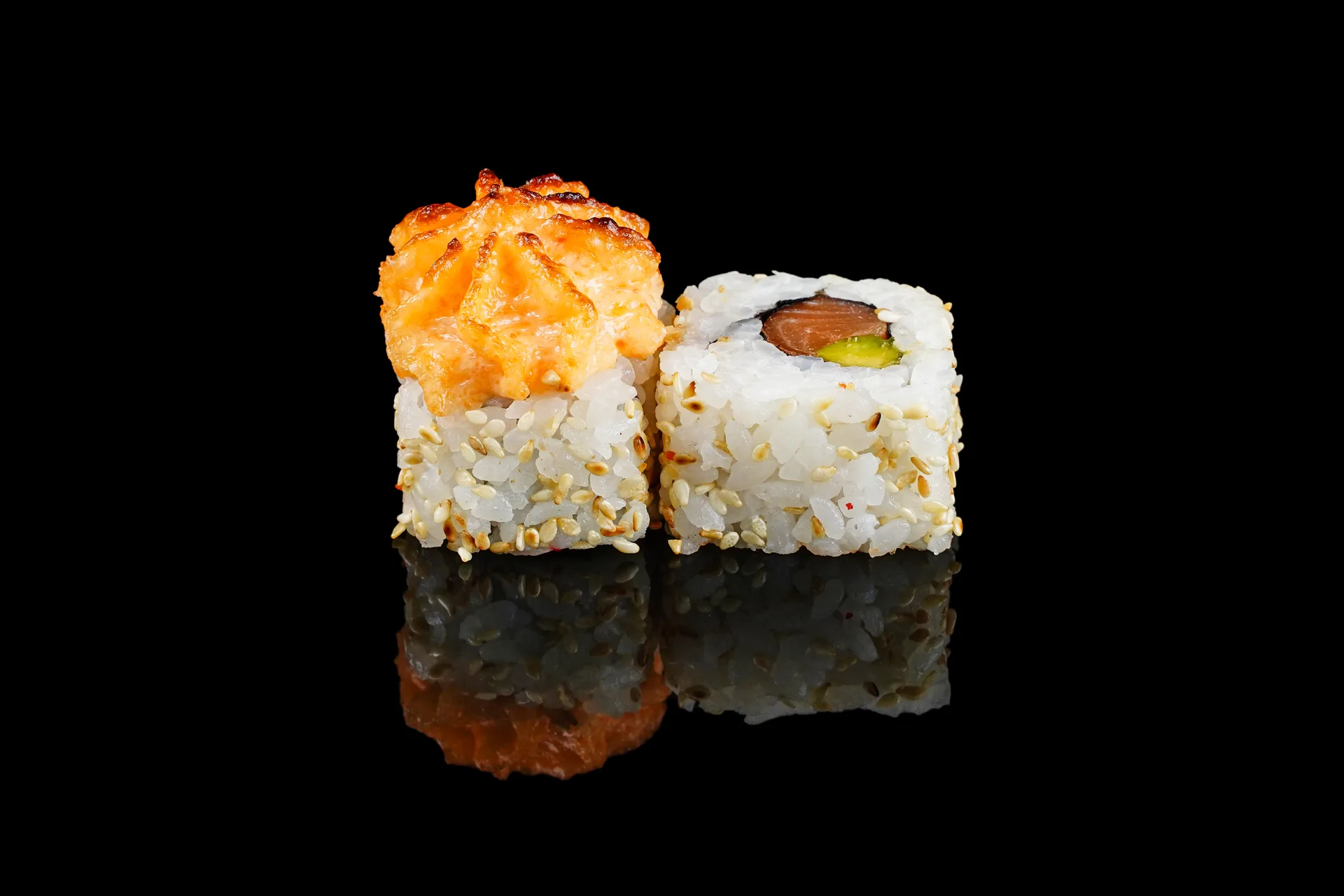 Лосось, гребешок, икра Тобико, огурец, майонез.