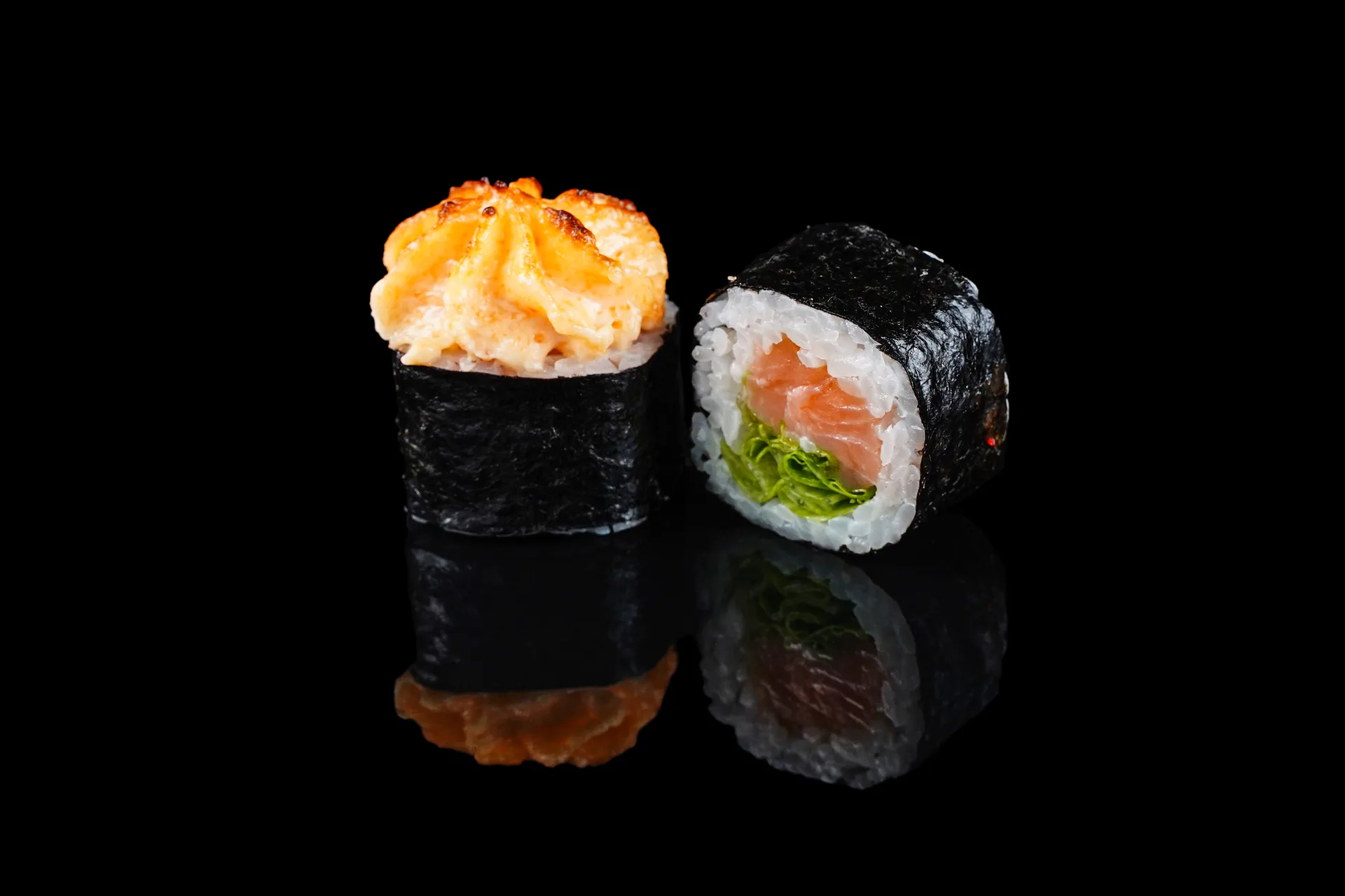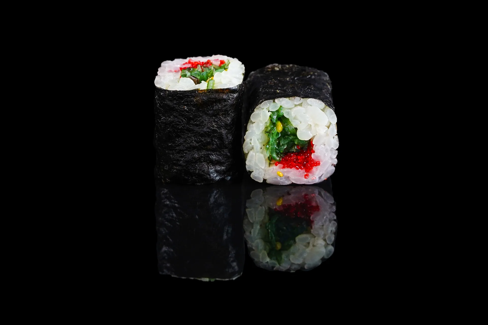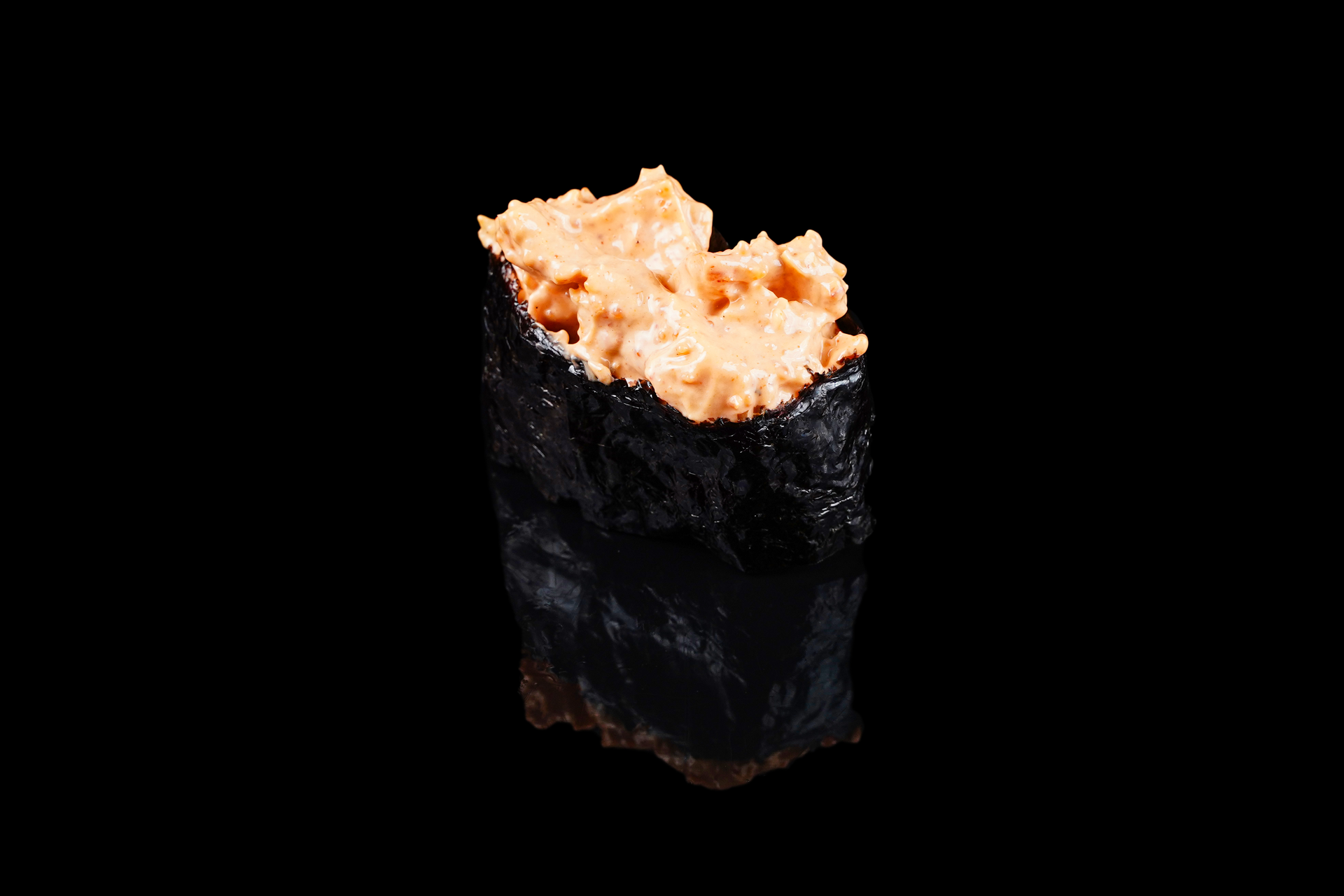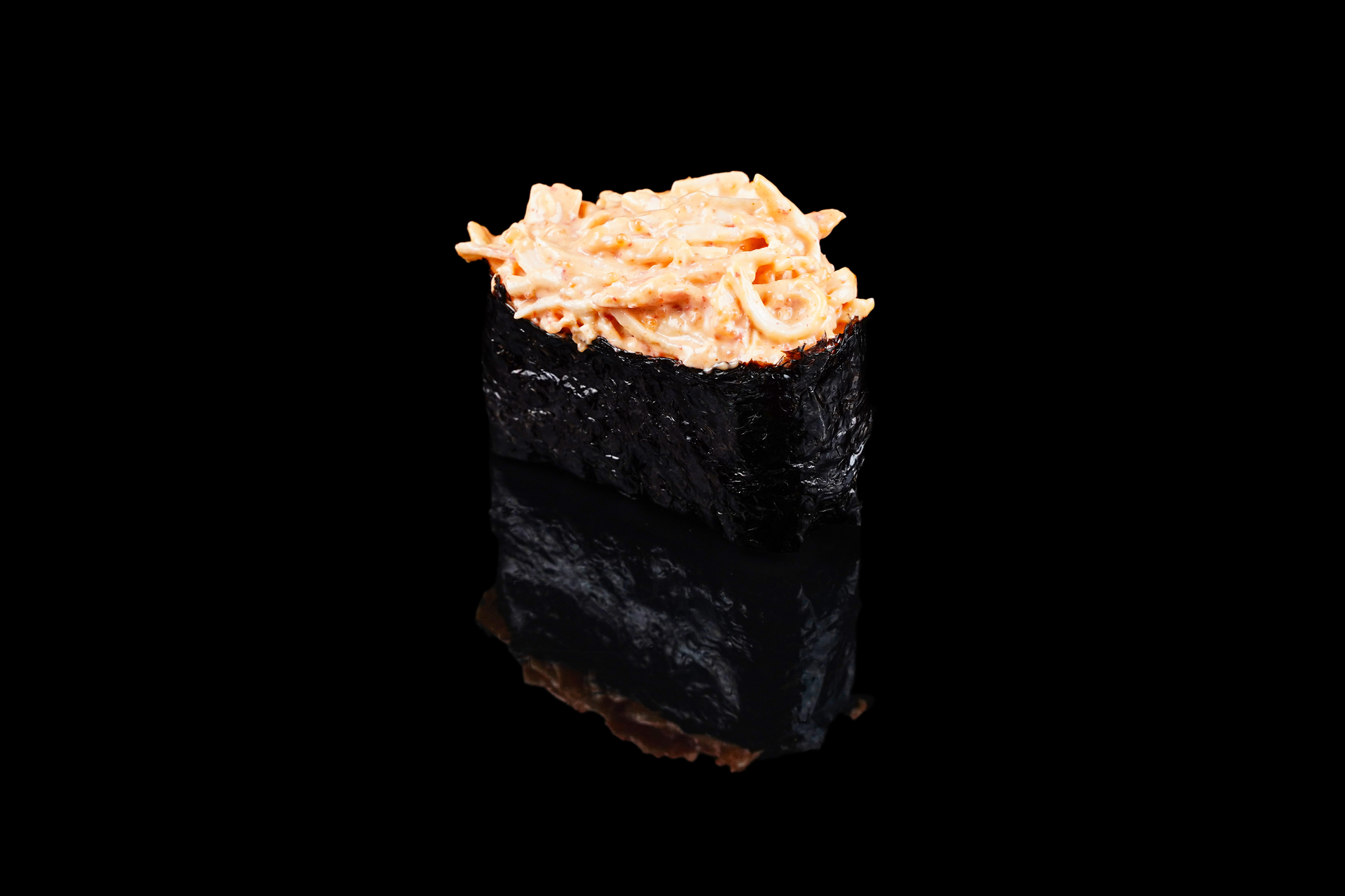 Лосось, гребешок, икра Тобико, огурец, майонез.