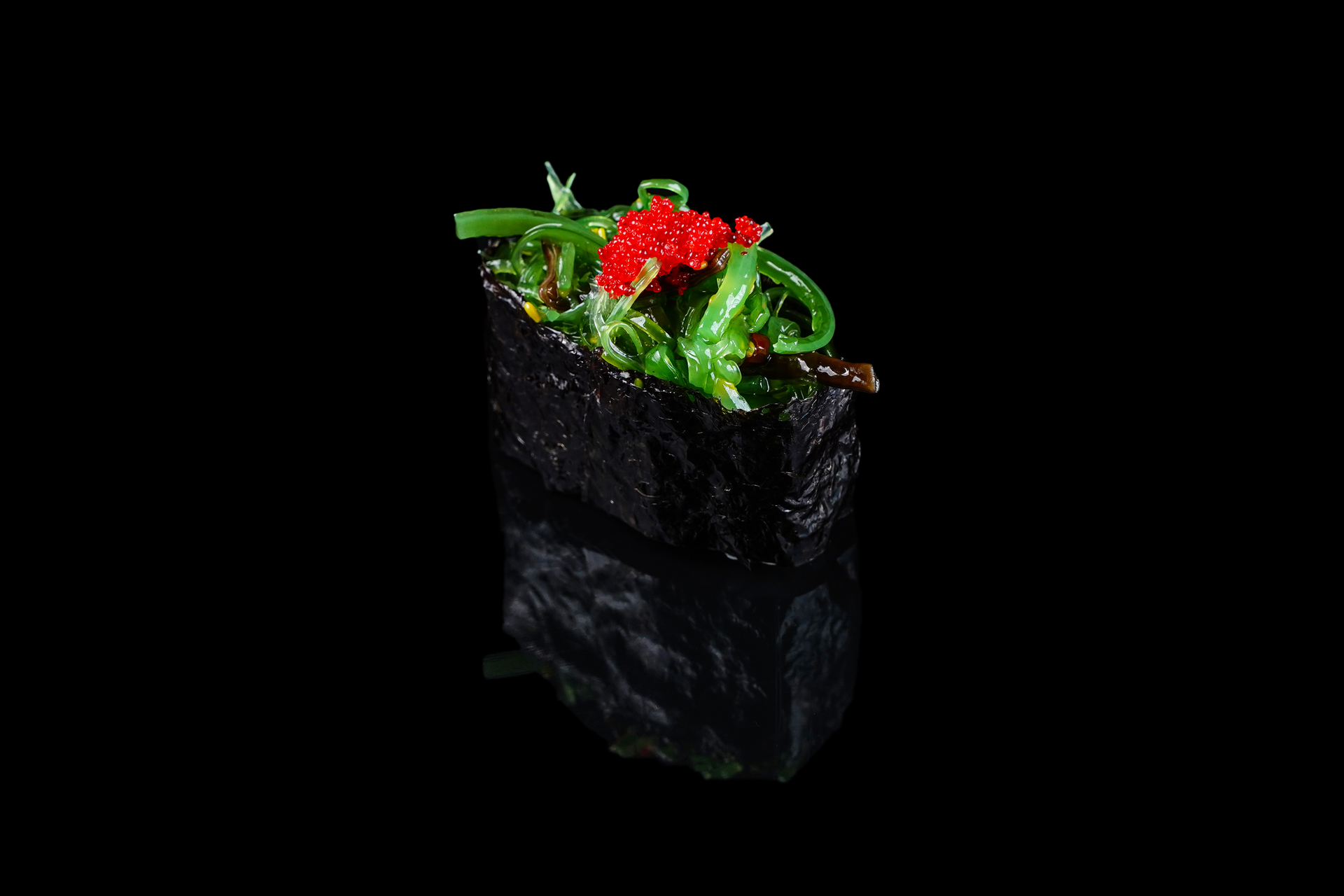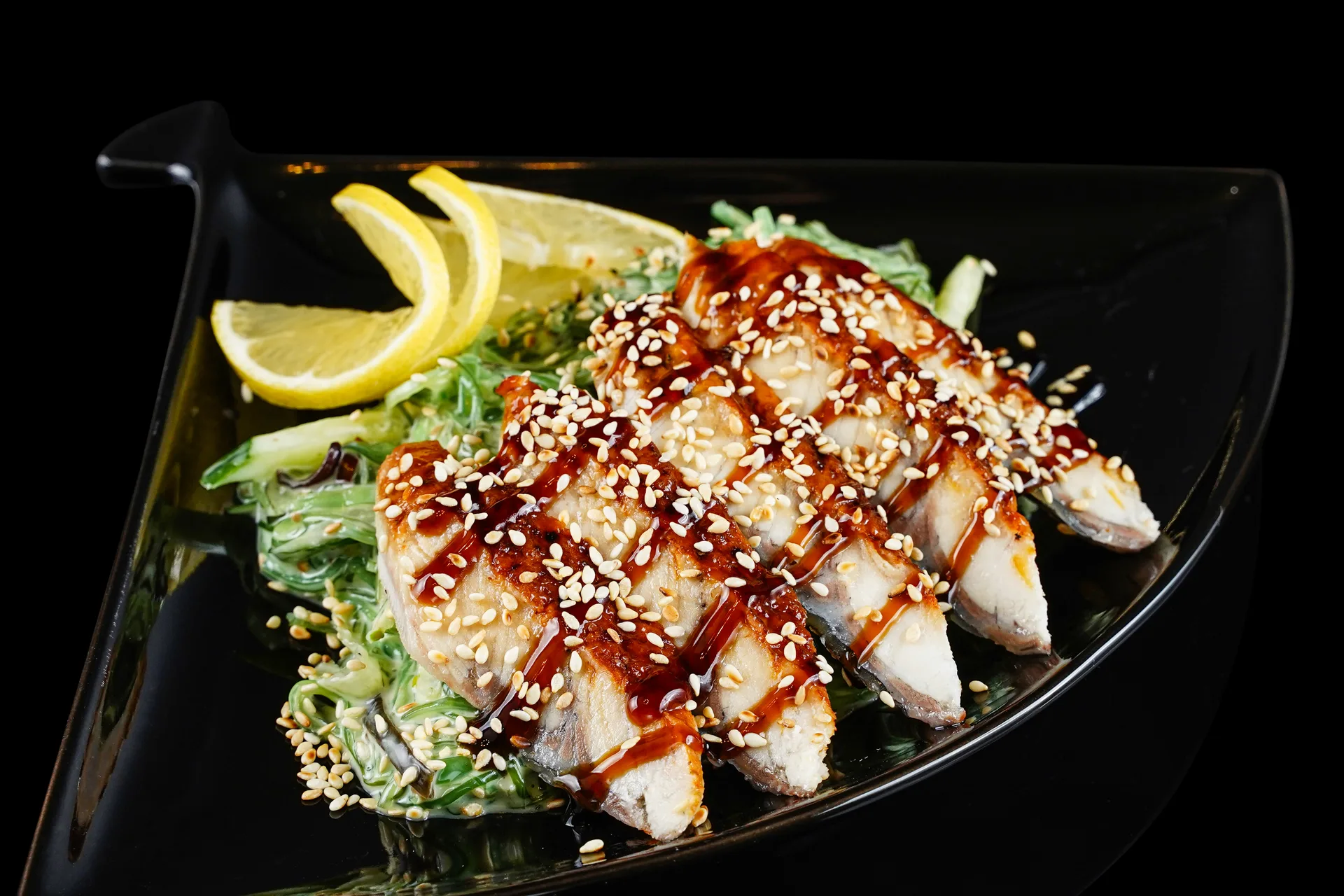 Угорь, Чука салат, огурец, лимон, соус Гамадари, Черри, кунжут, икра тобико