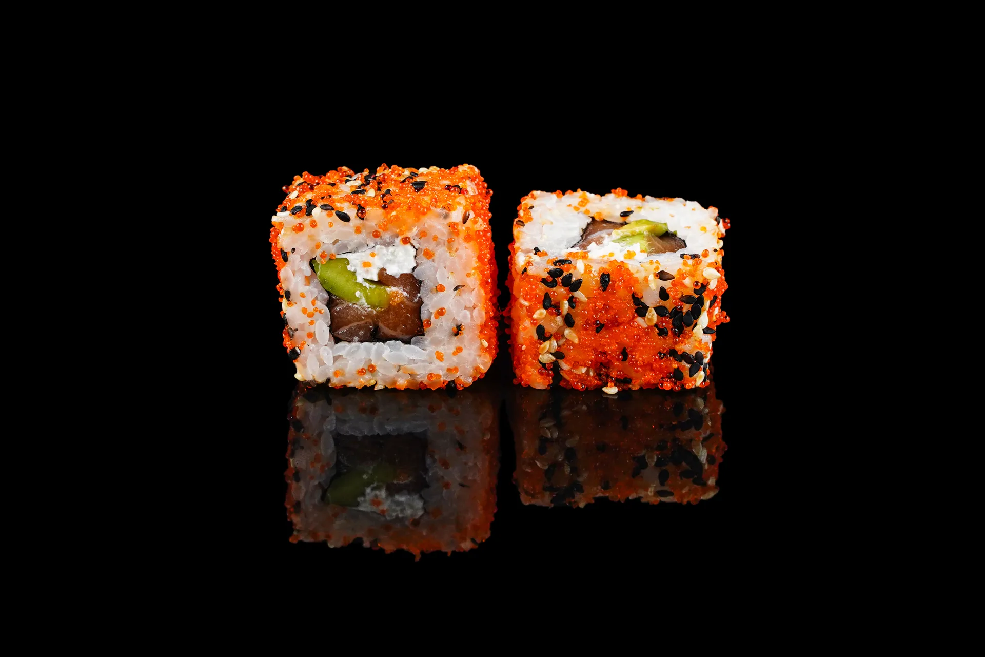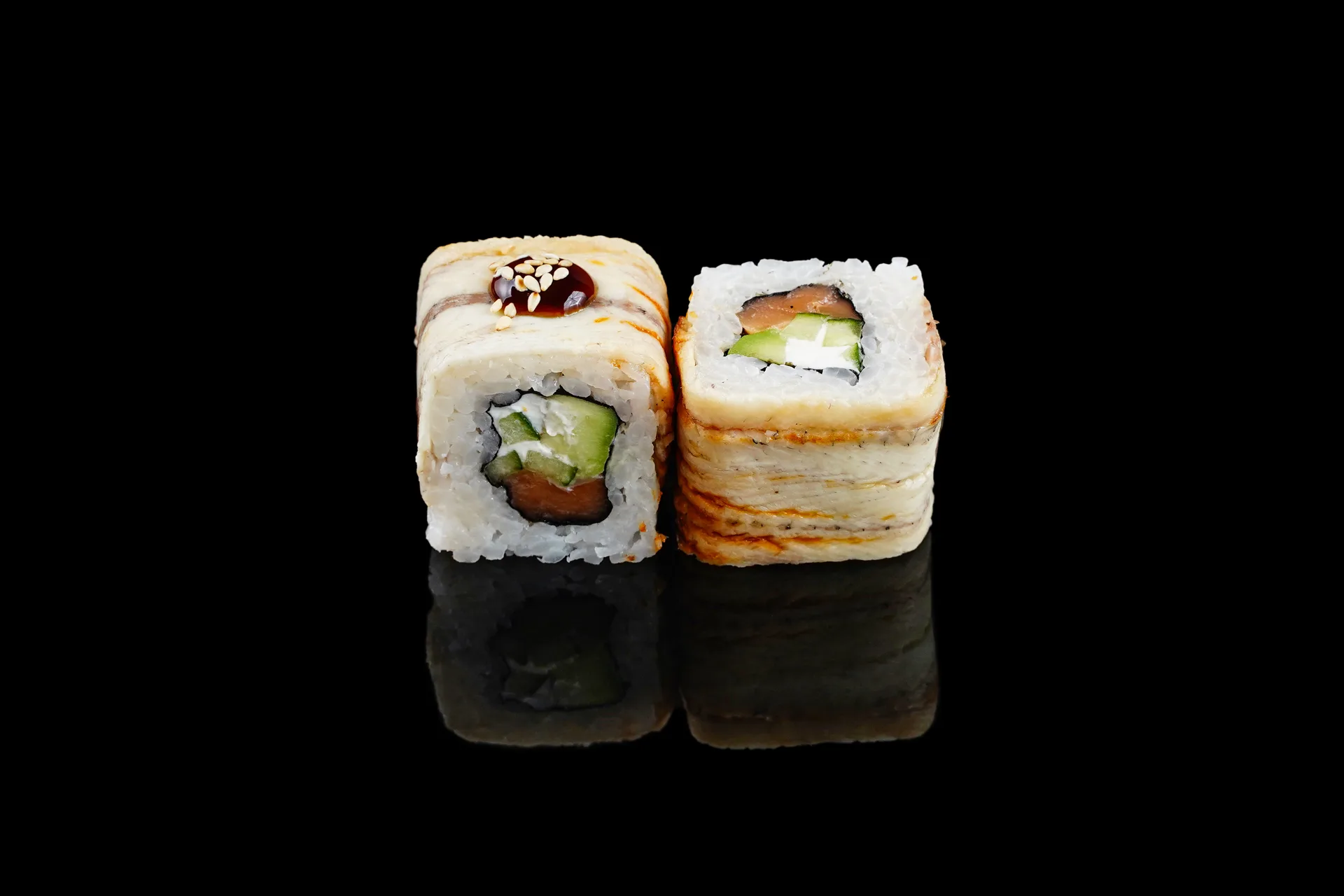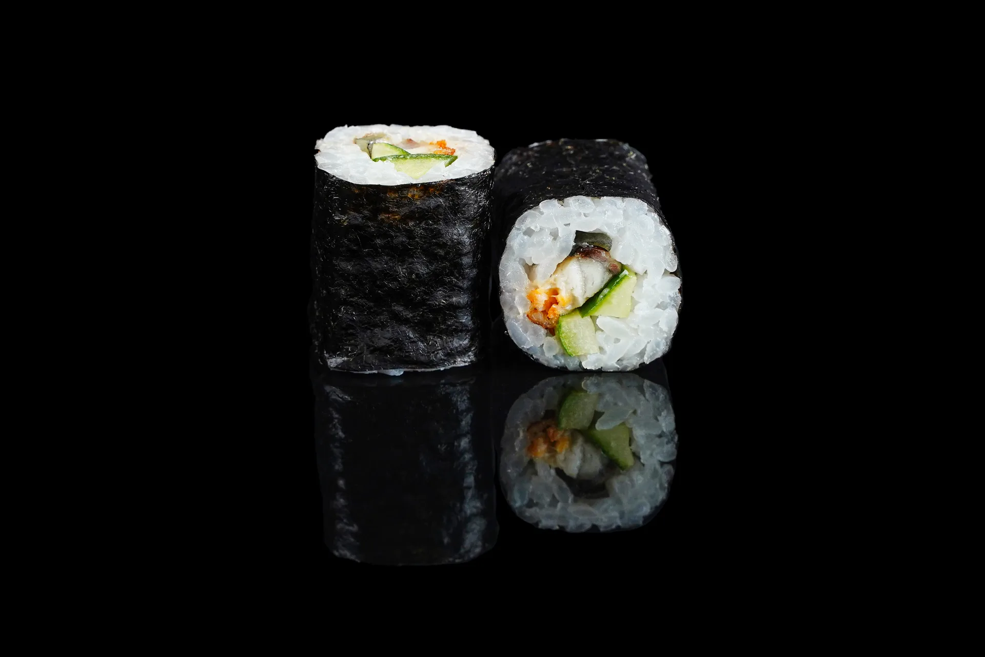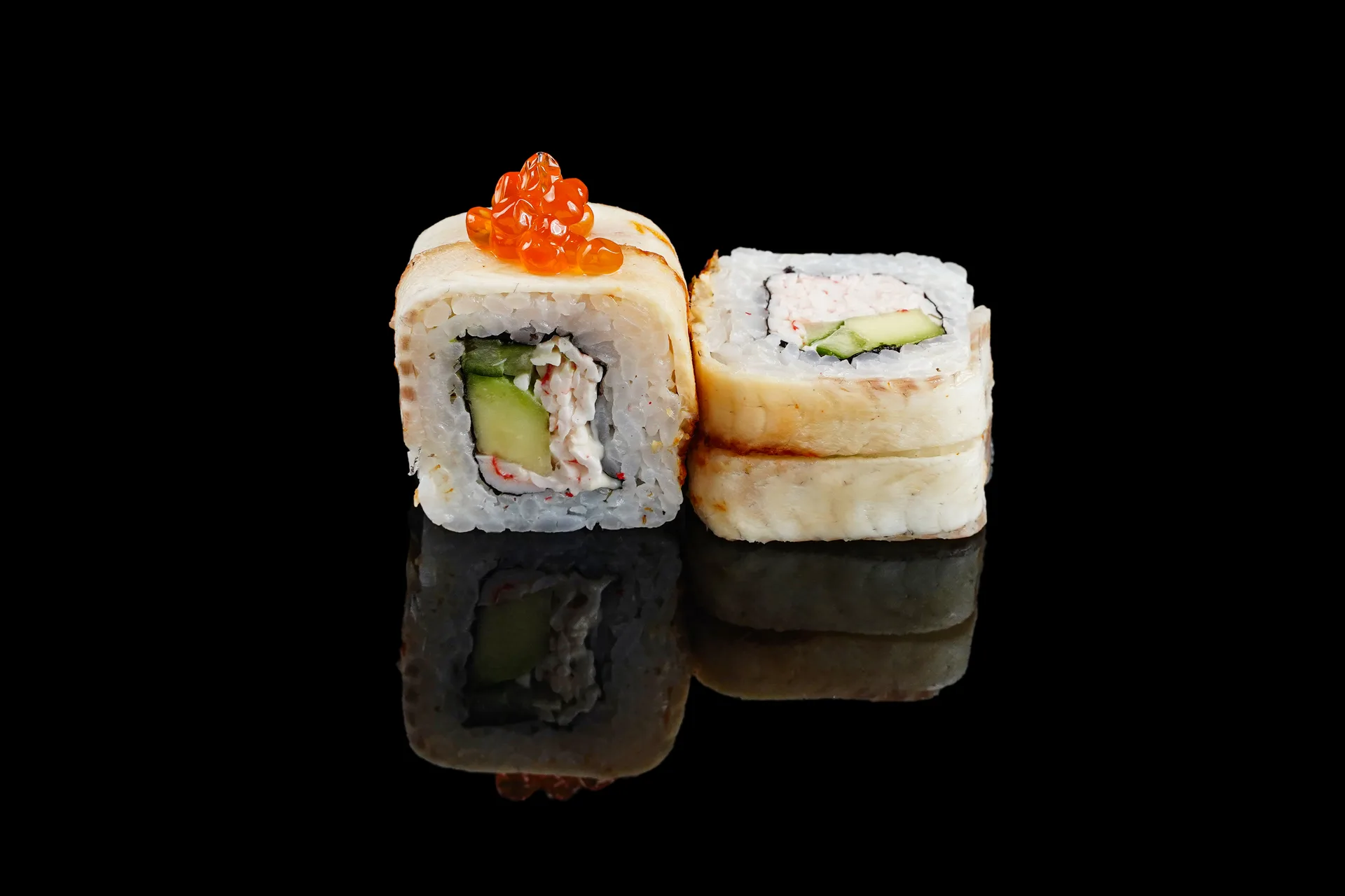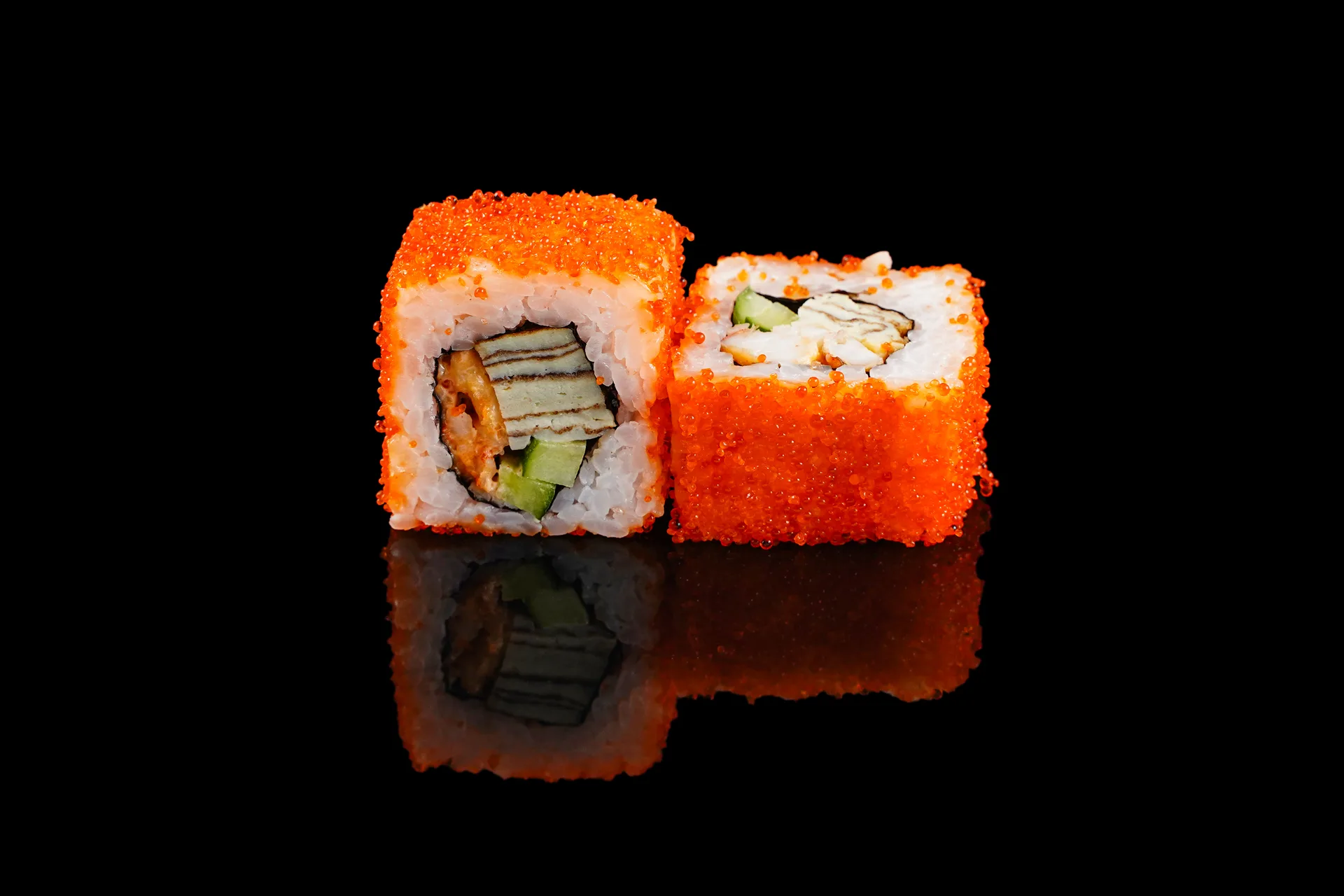 Угорь, гребешок, икра Тобико, огурец, майонез.