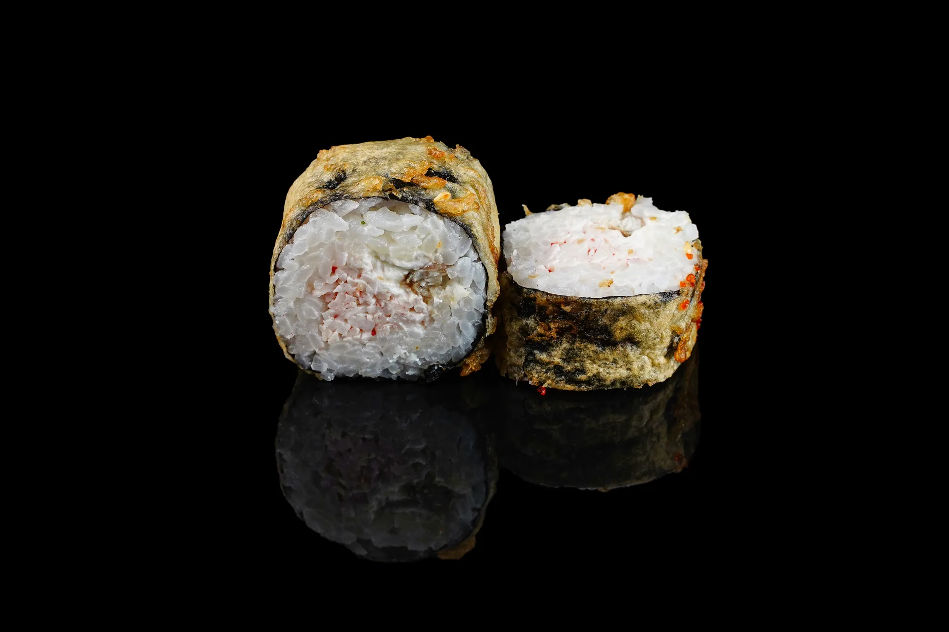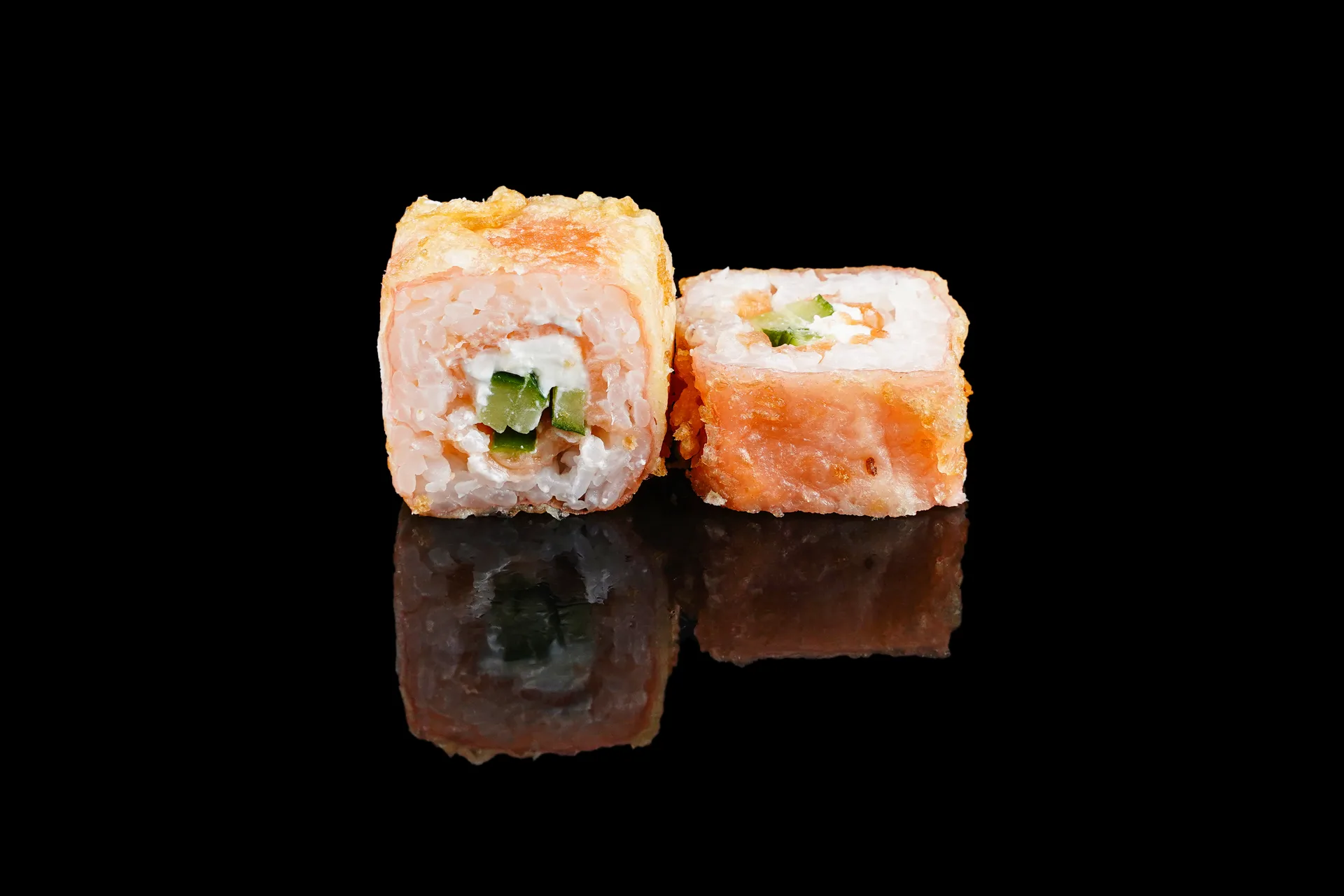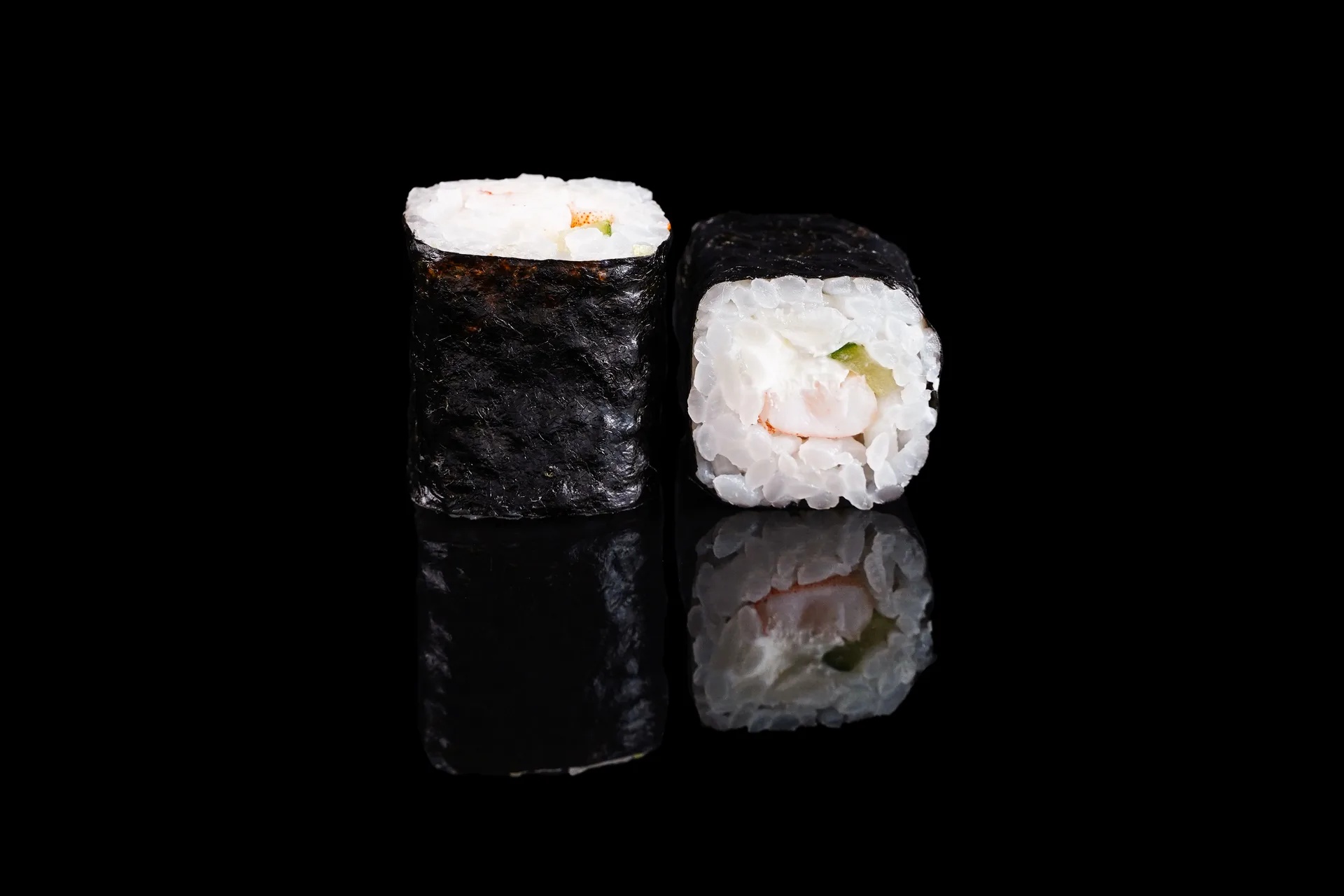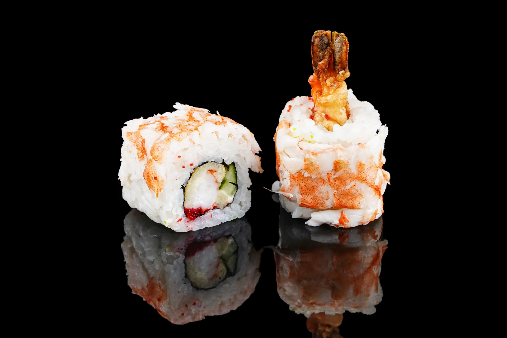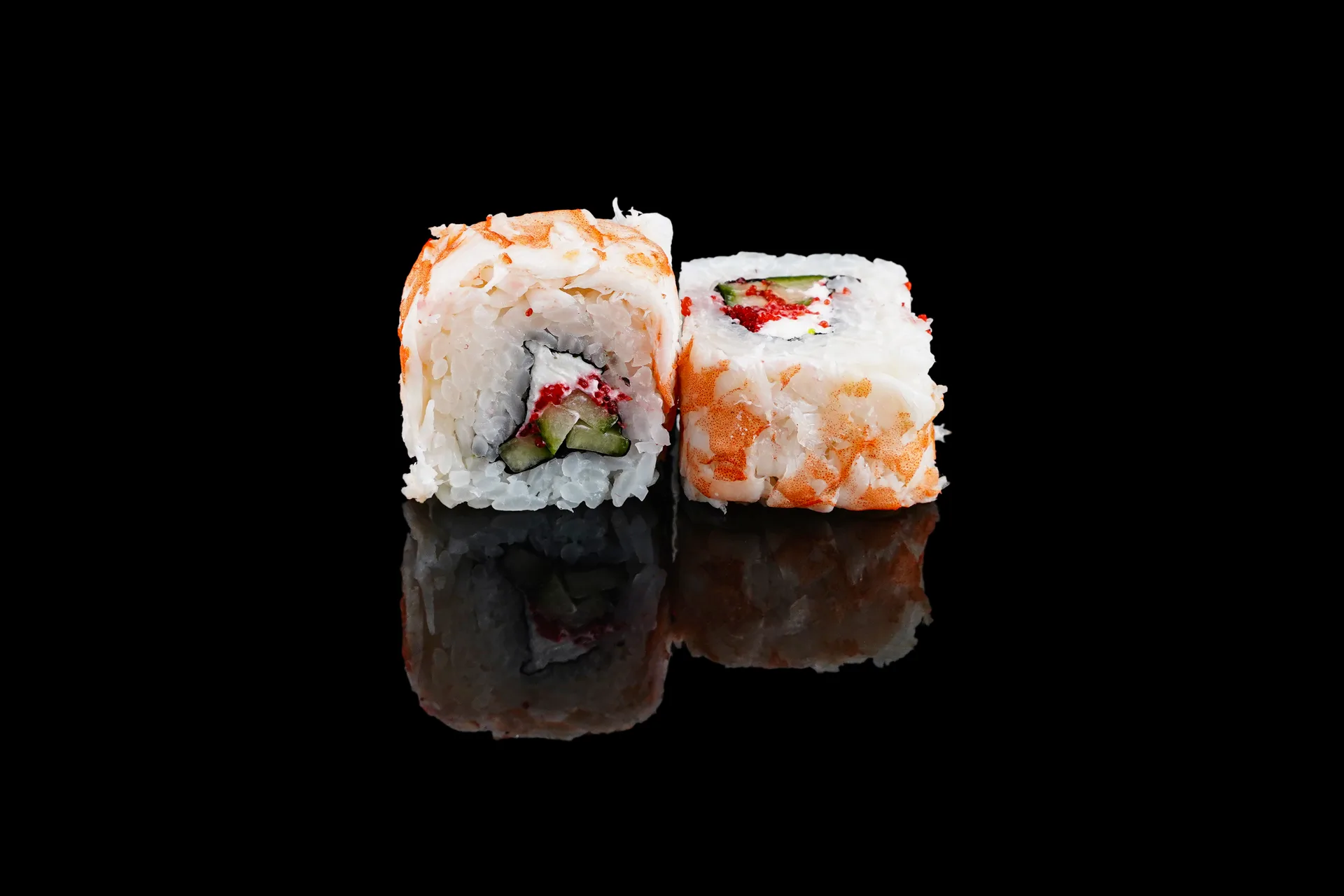 Креветка в темпуре, креветка отварная, огурец, икра Тобико, майонез.