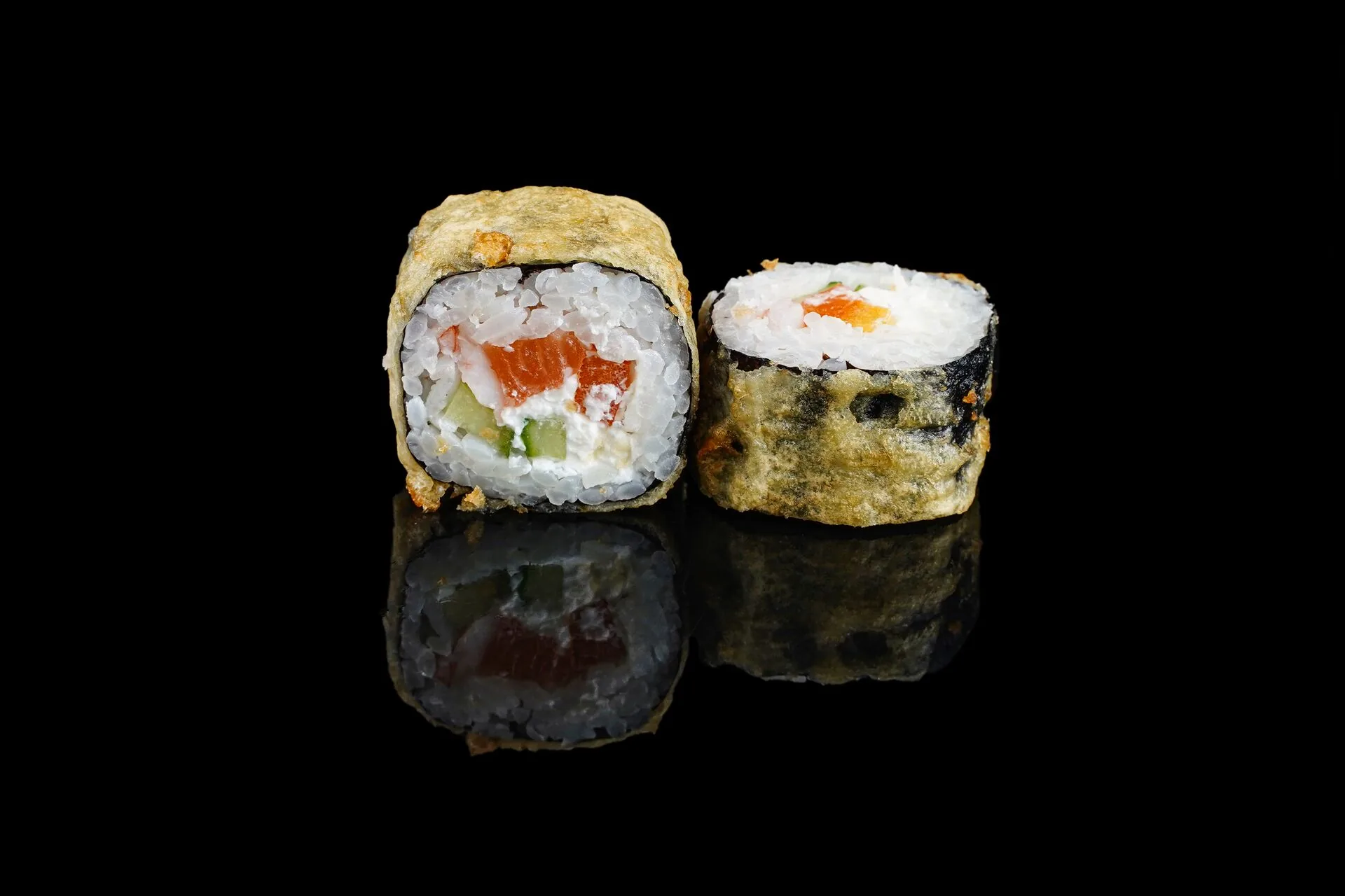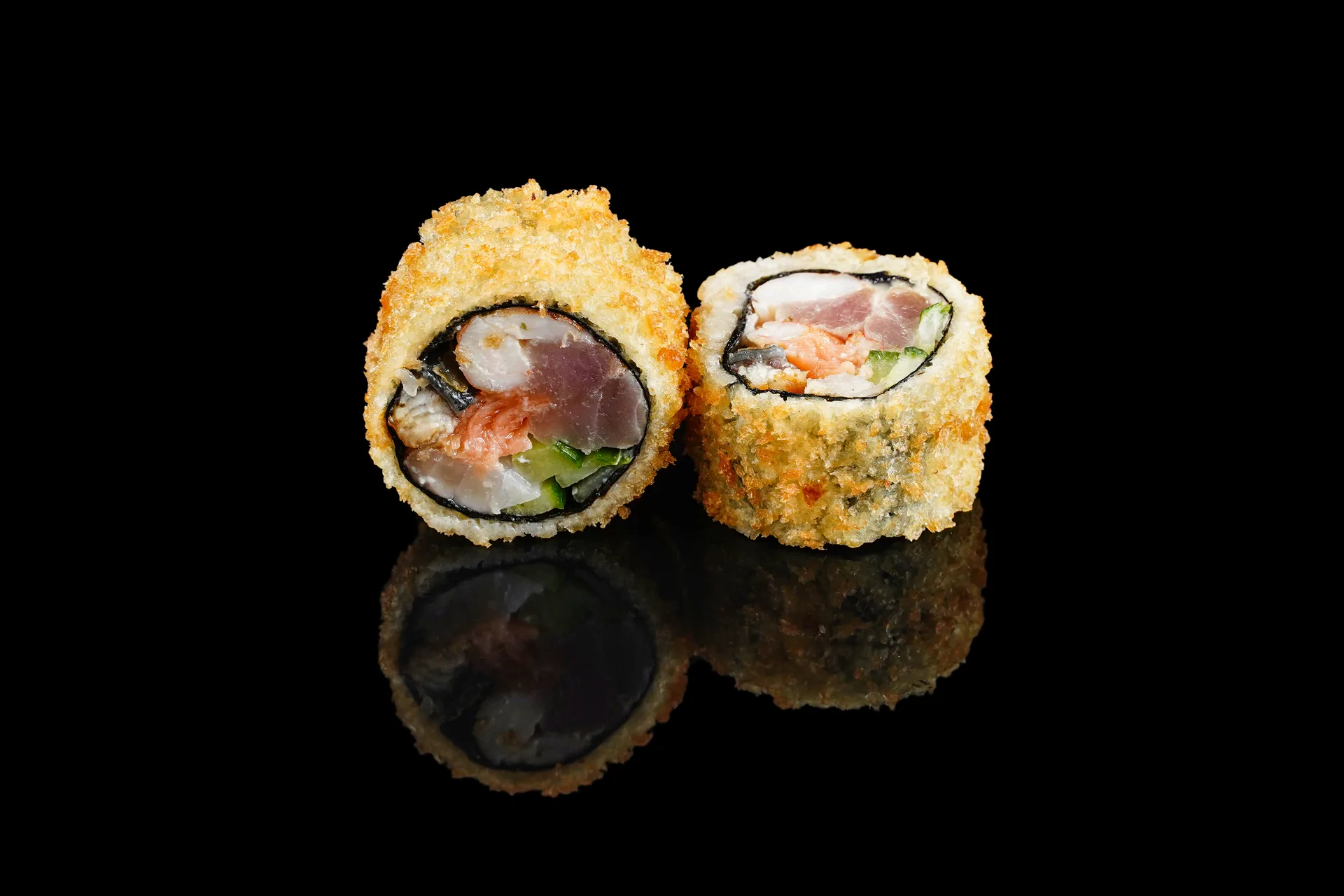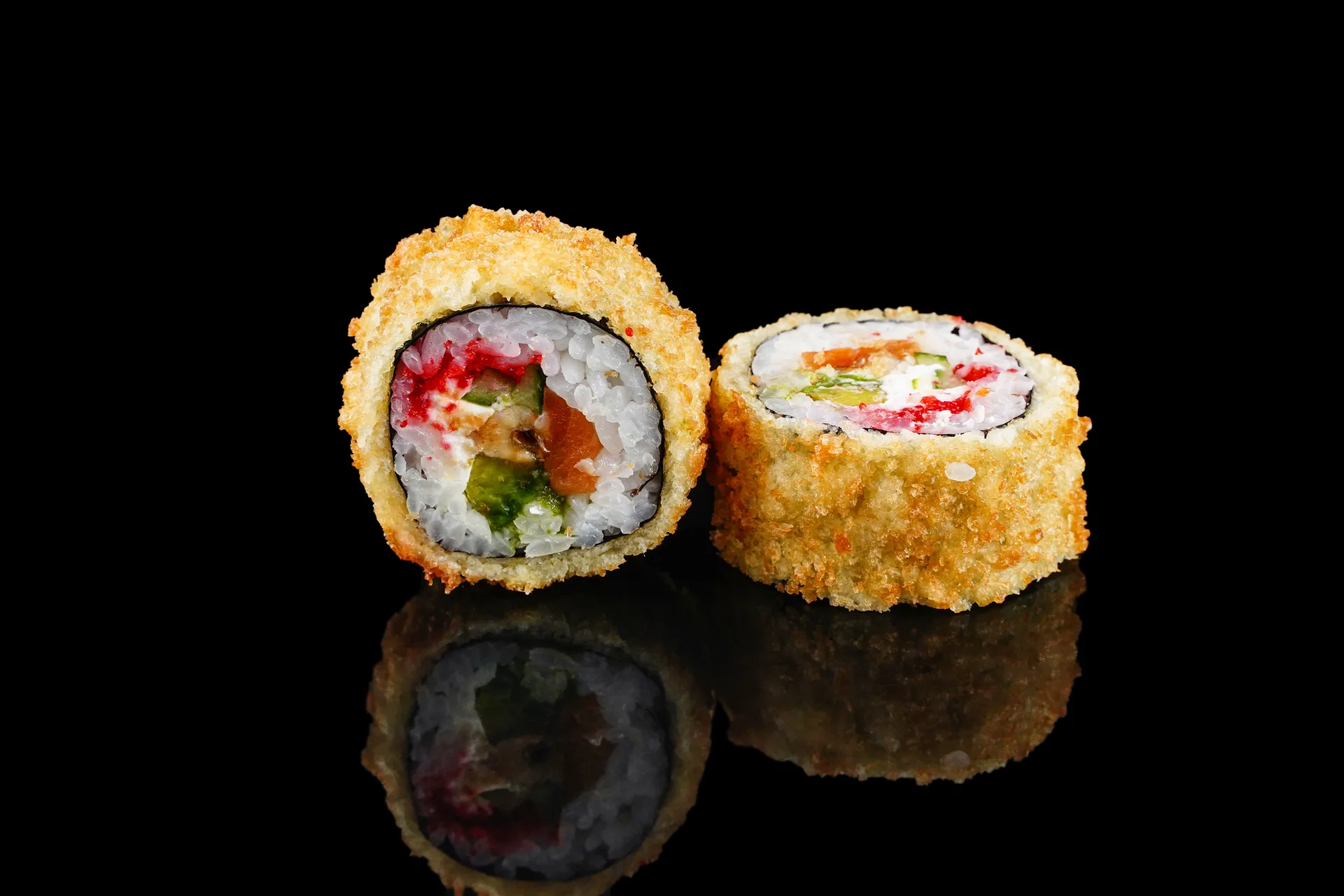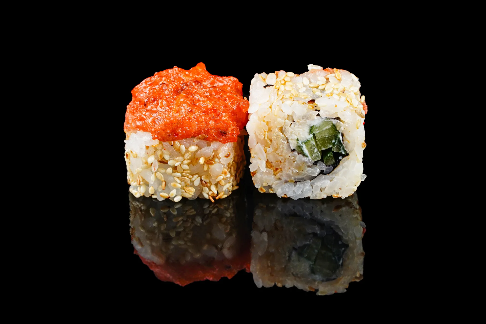 Креветка в темпуре, креветка отварная, огурец, икра Тобико, майонез.