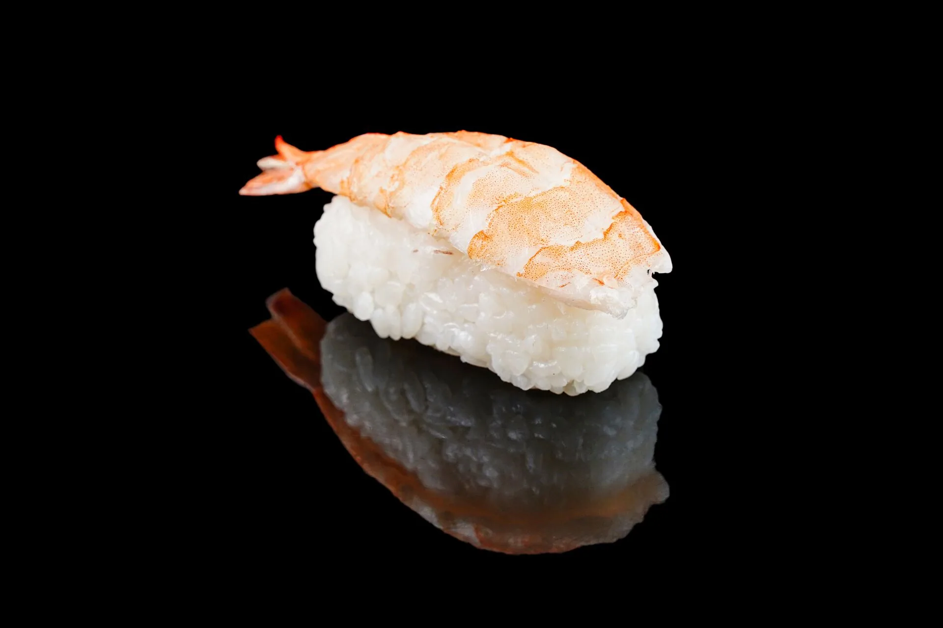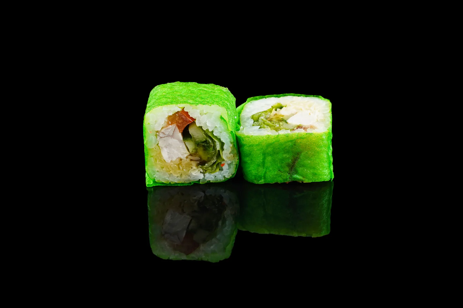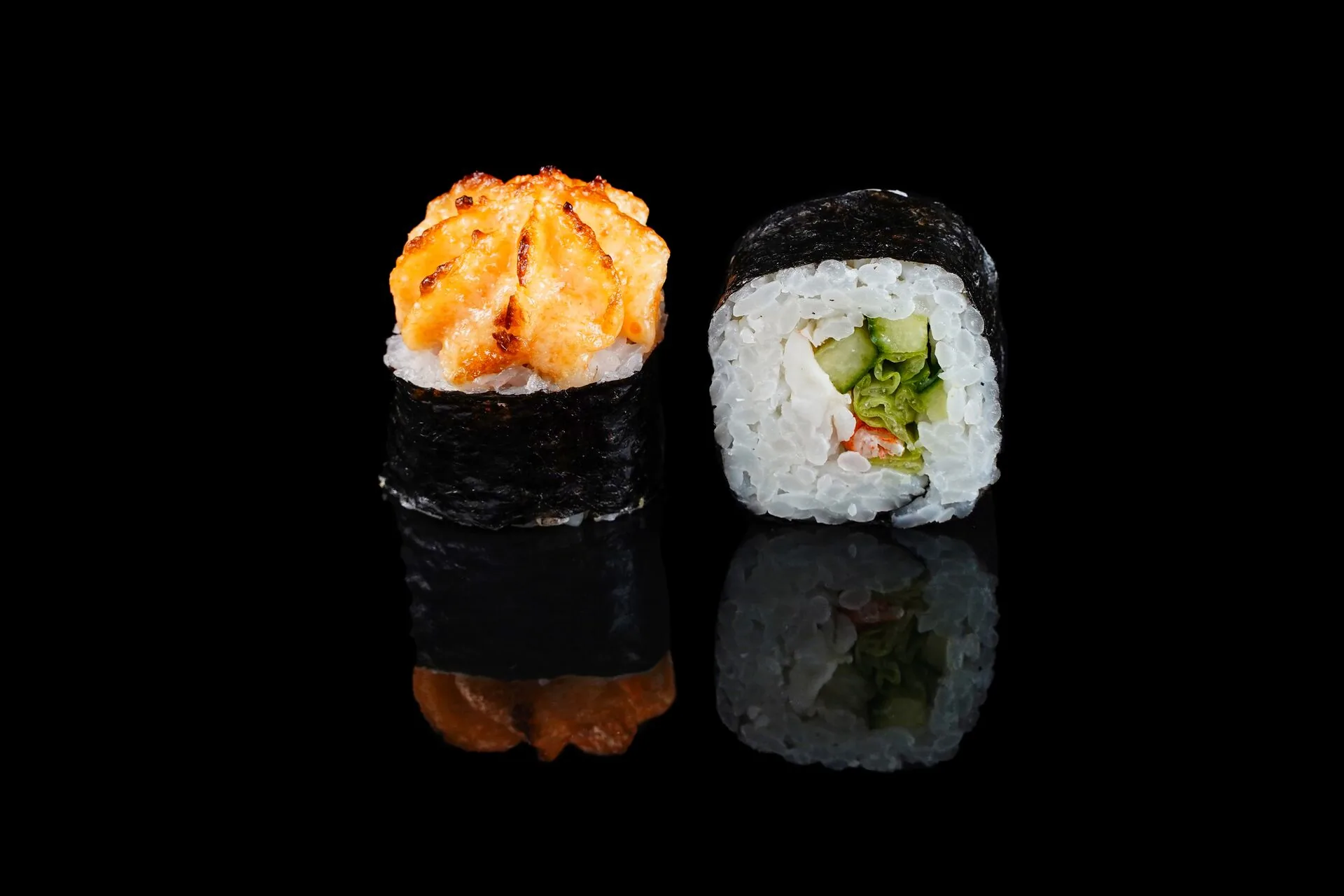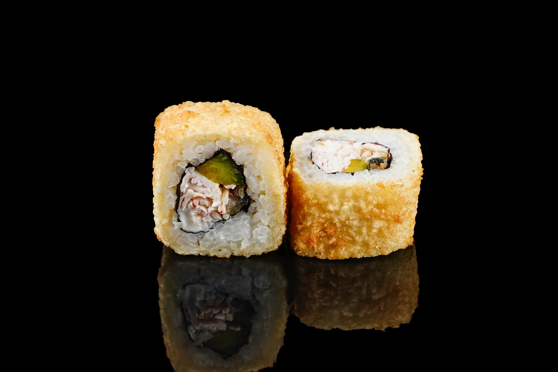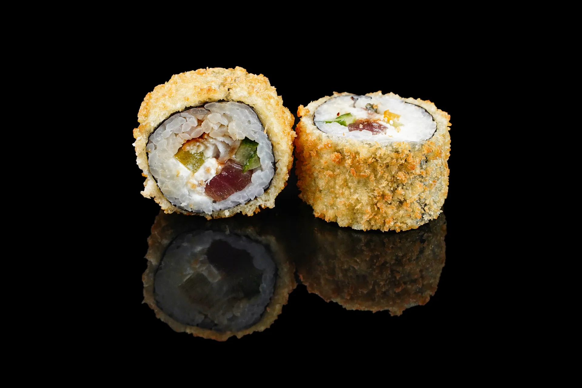 Креветка в темпуре, креветка отварная, огурец, икра Тобико, майонез.