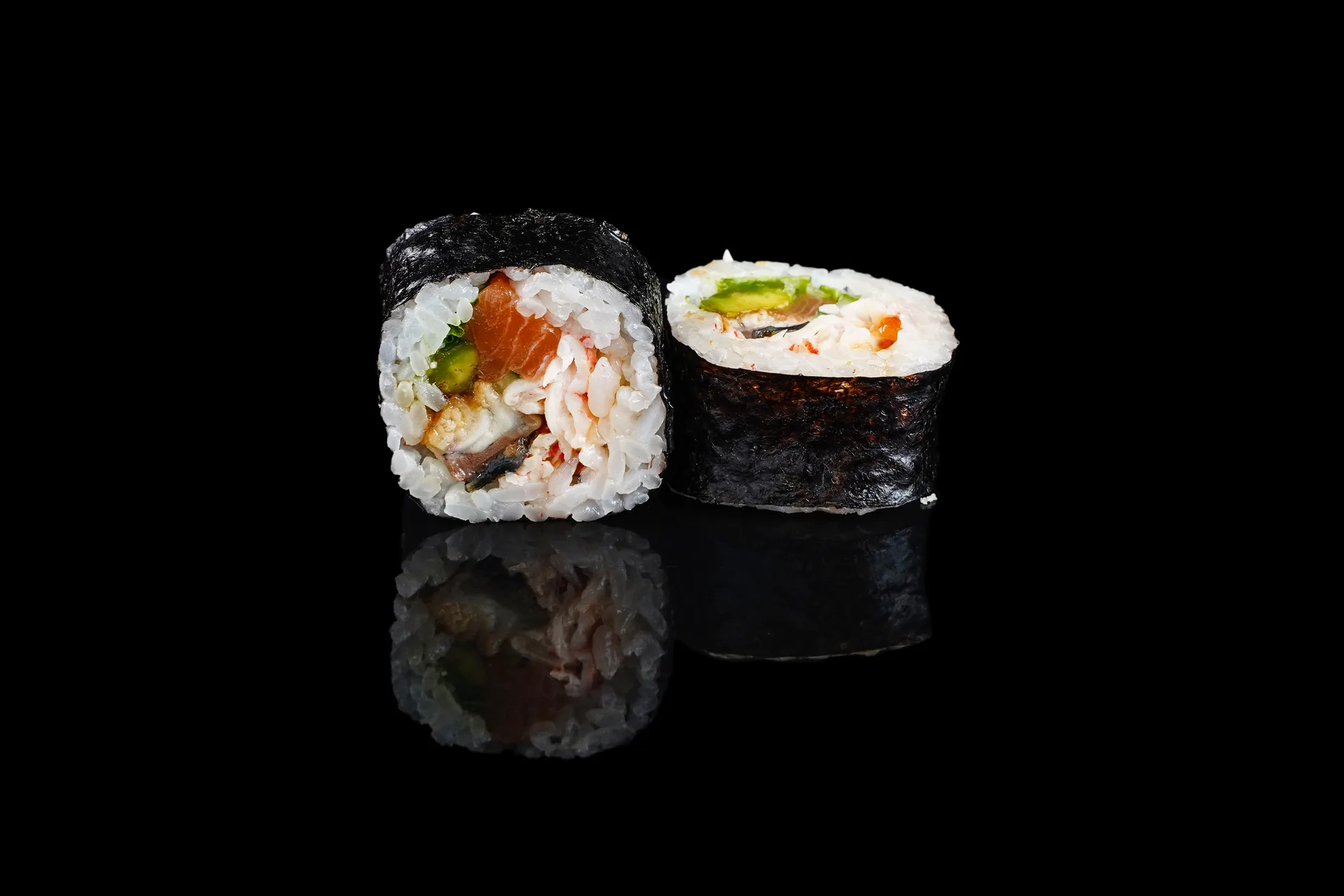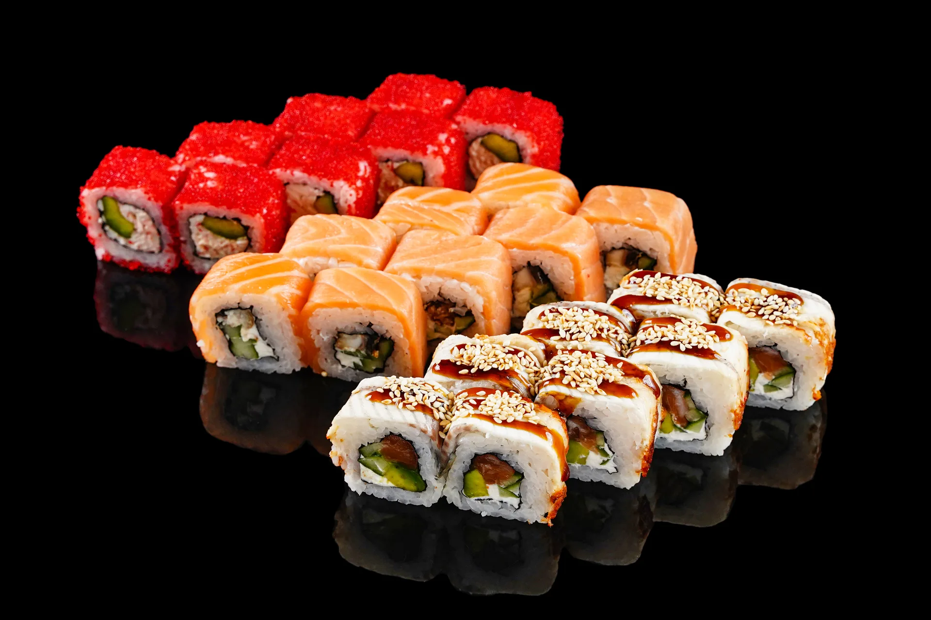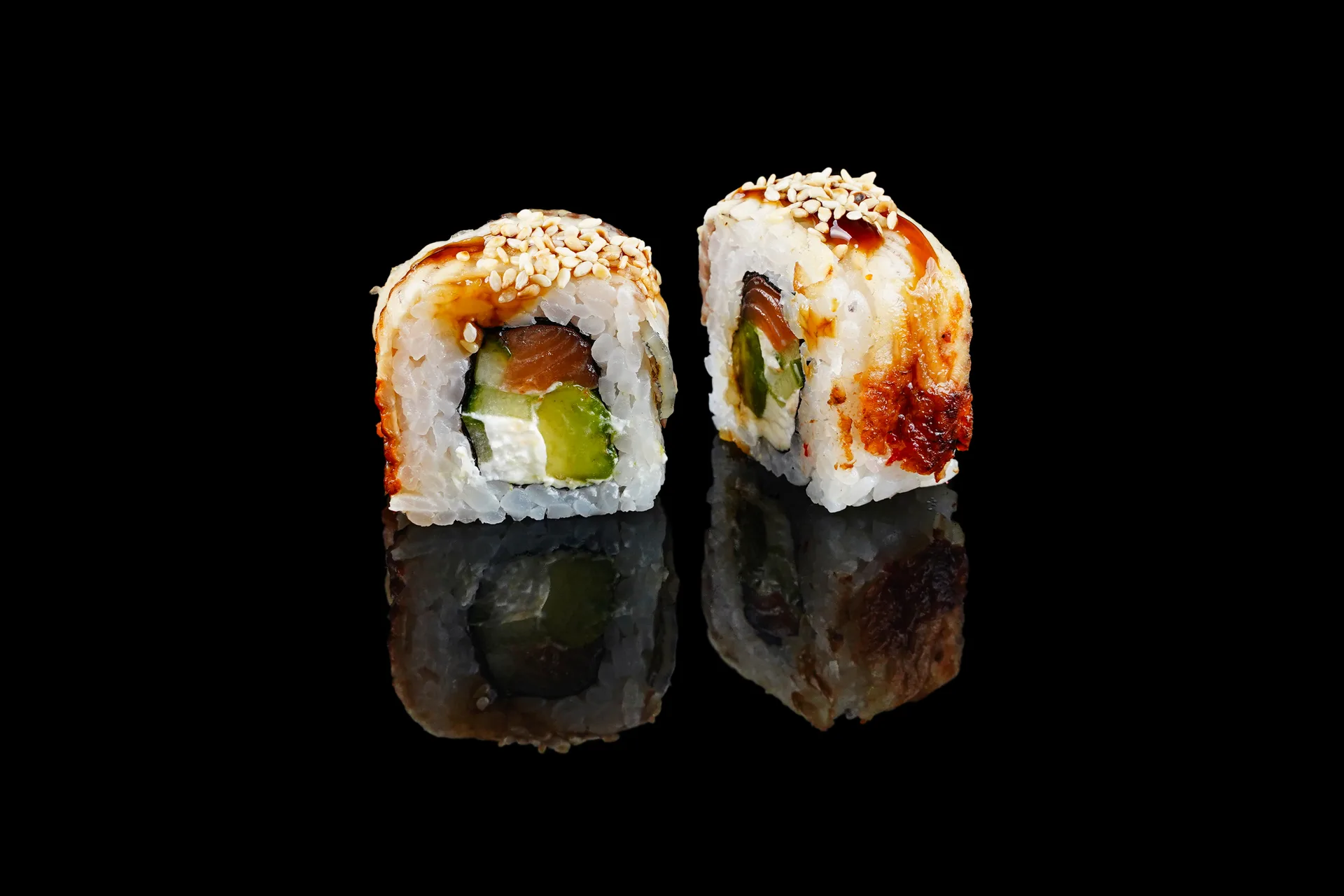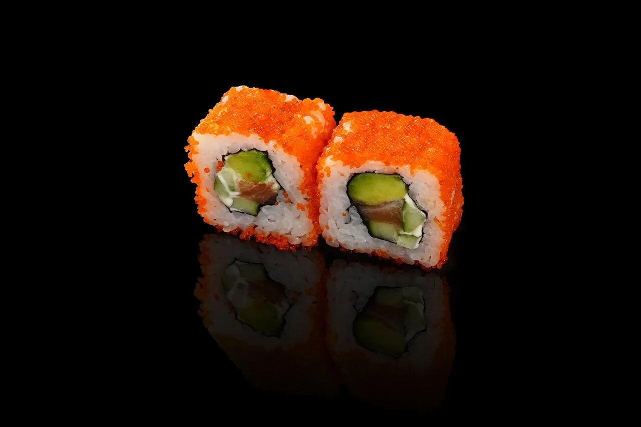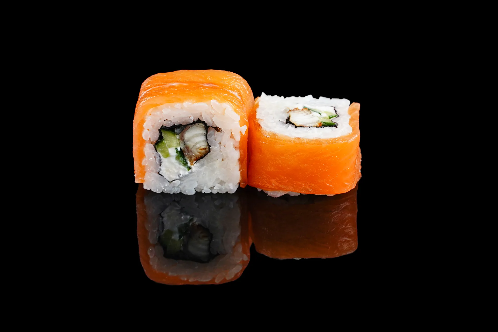 Угорь, сыр сливочный, огурец, авокадо, лосось, икра тобико