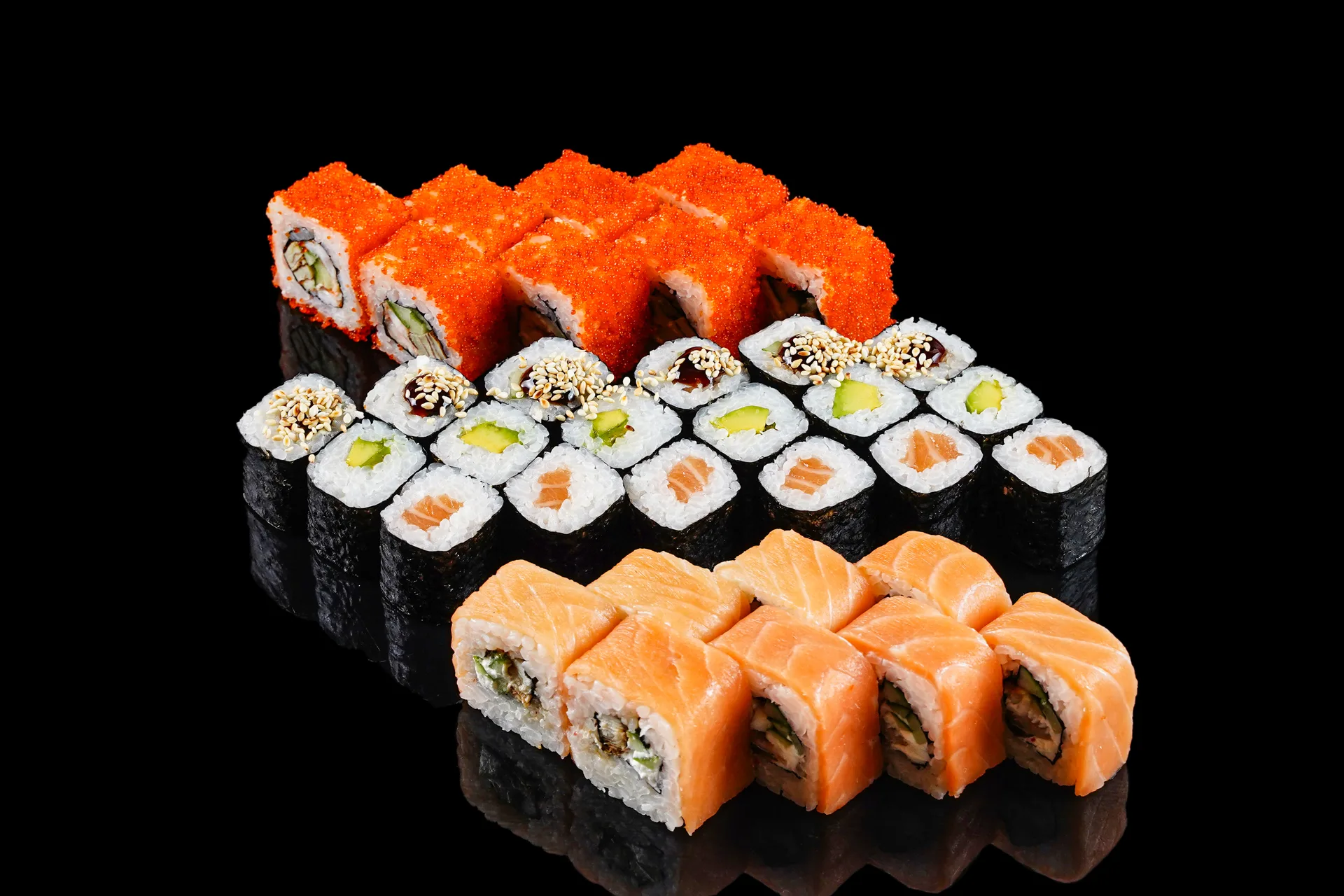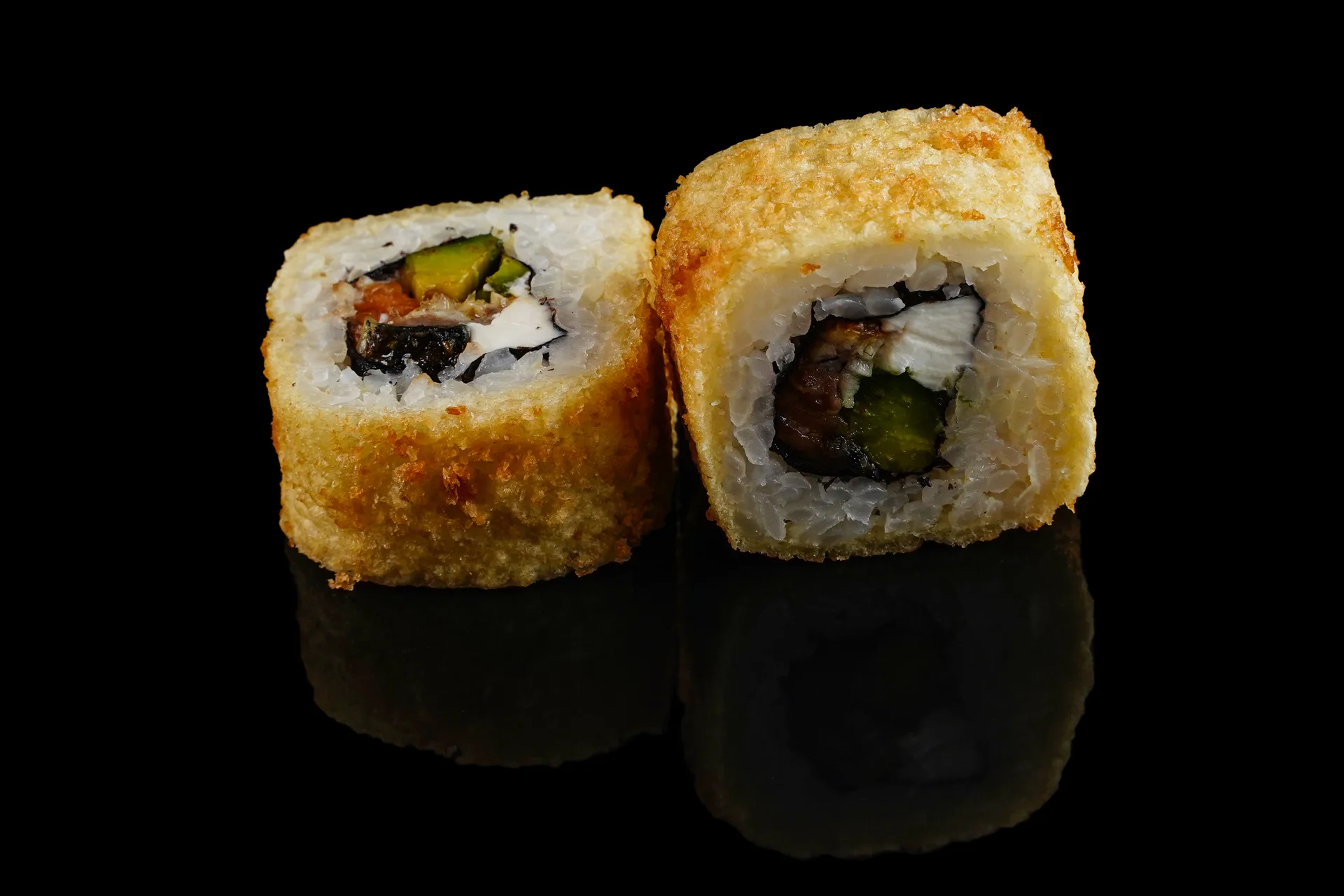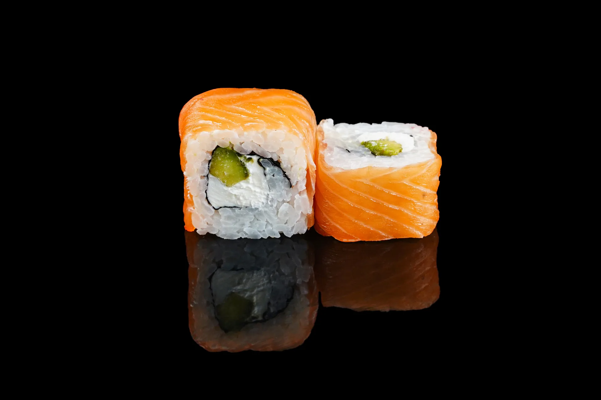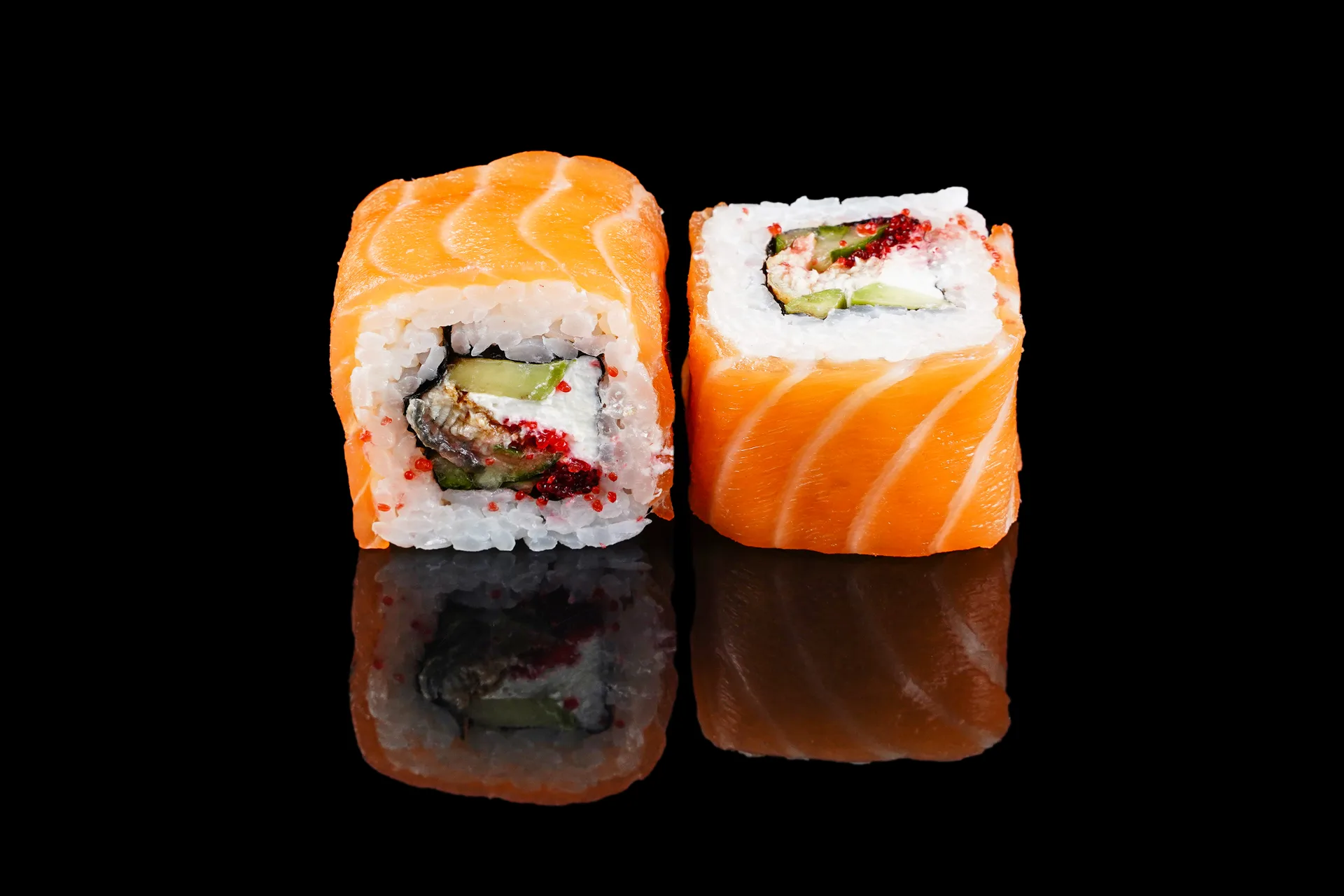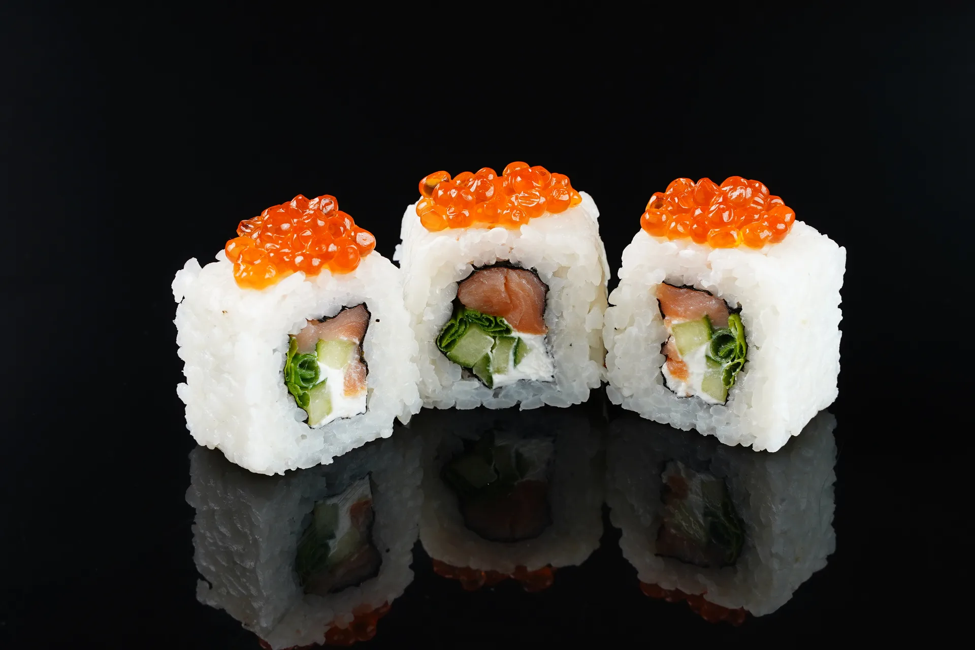 Угорь, сыр сливочный, огурец, авокадо, лосось, икра тобико