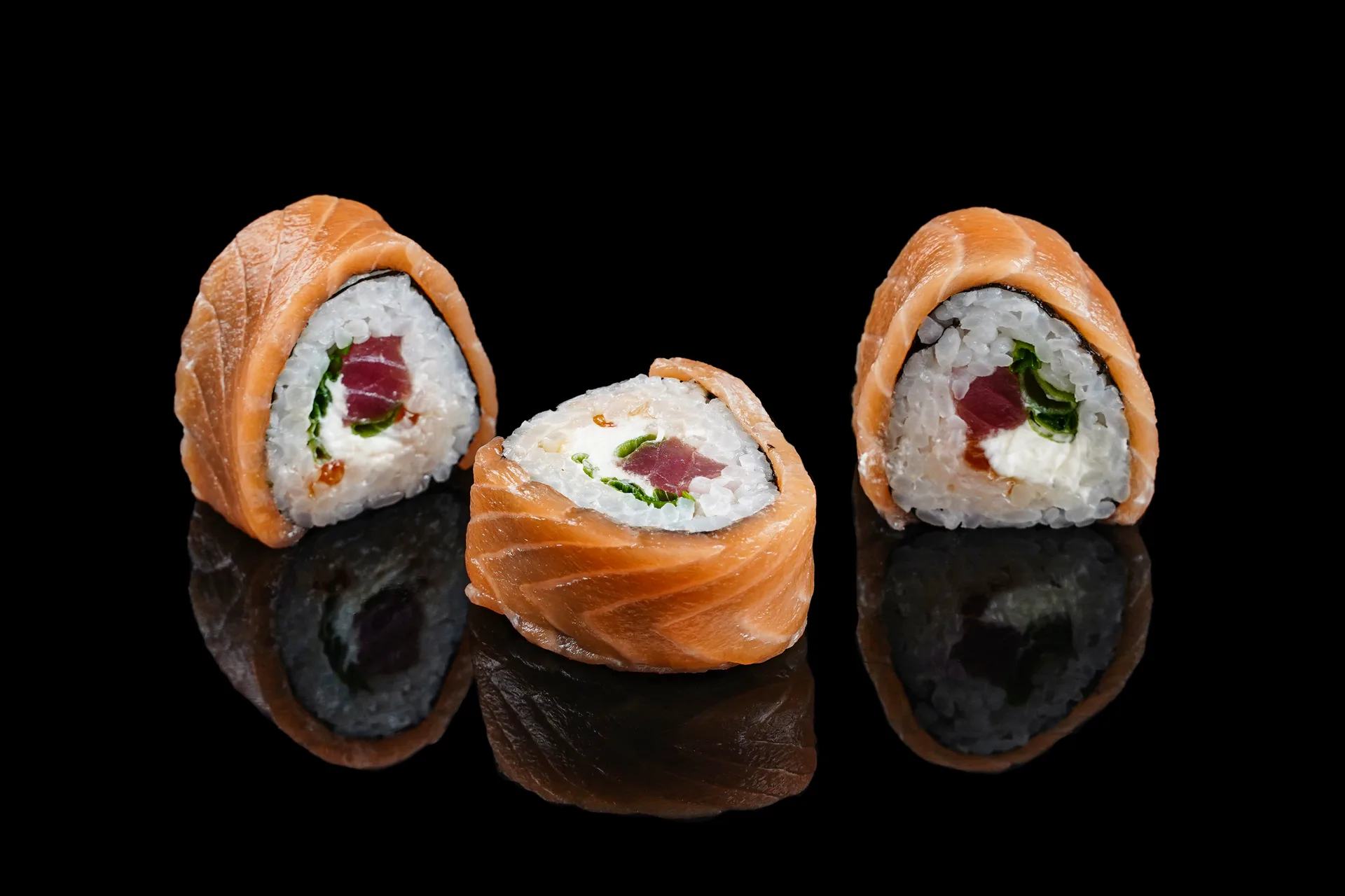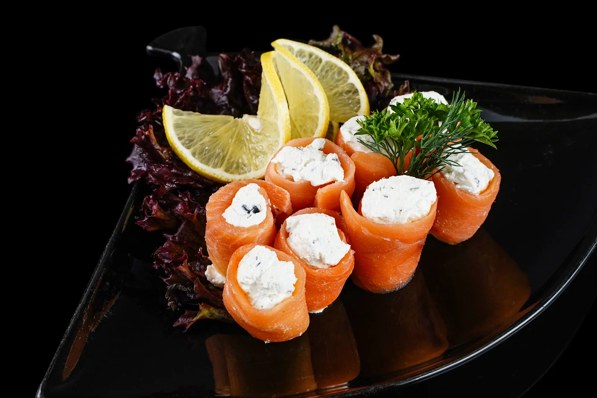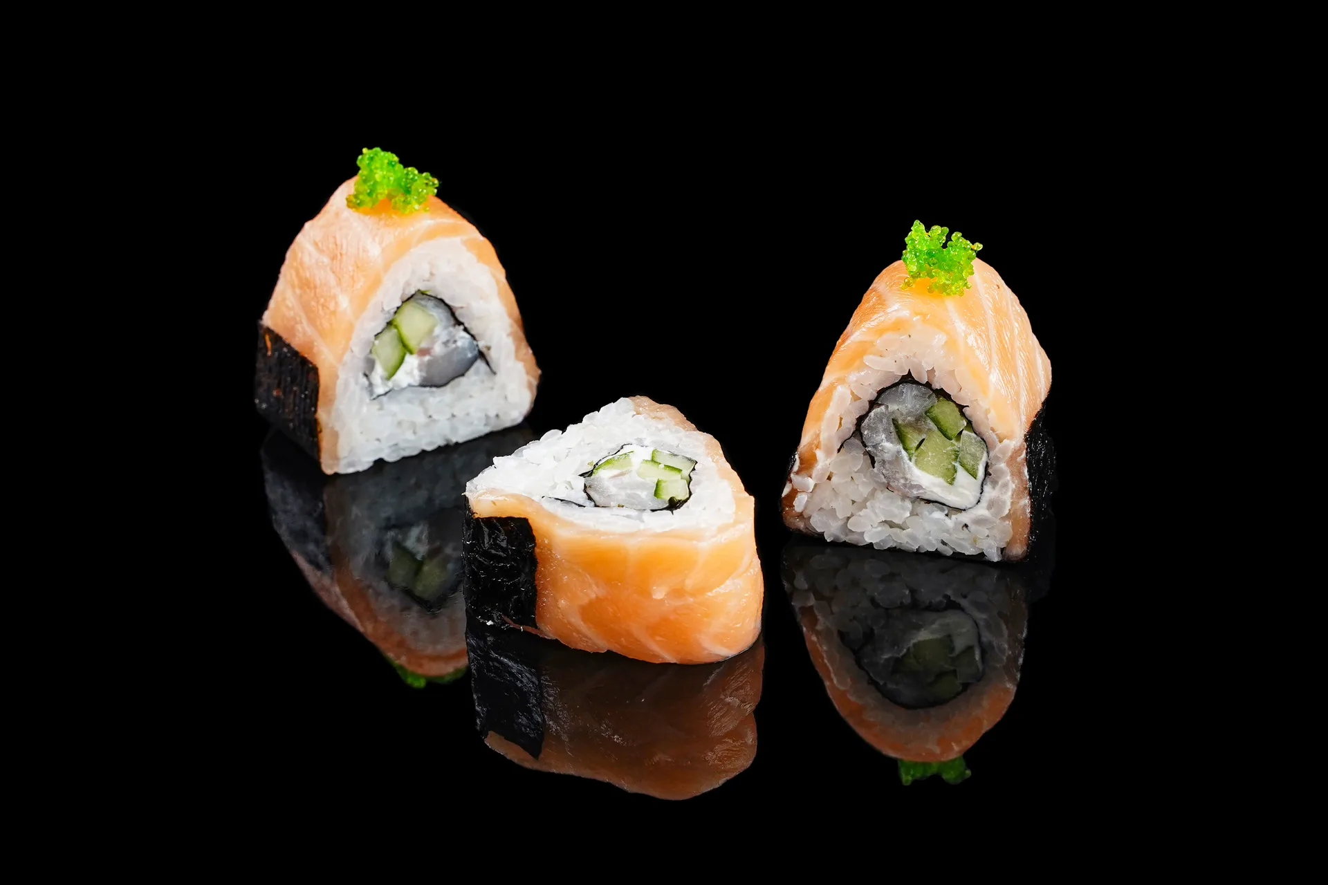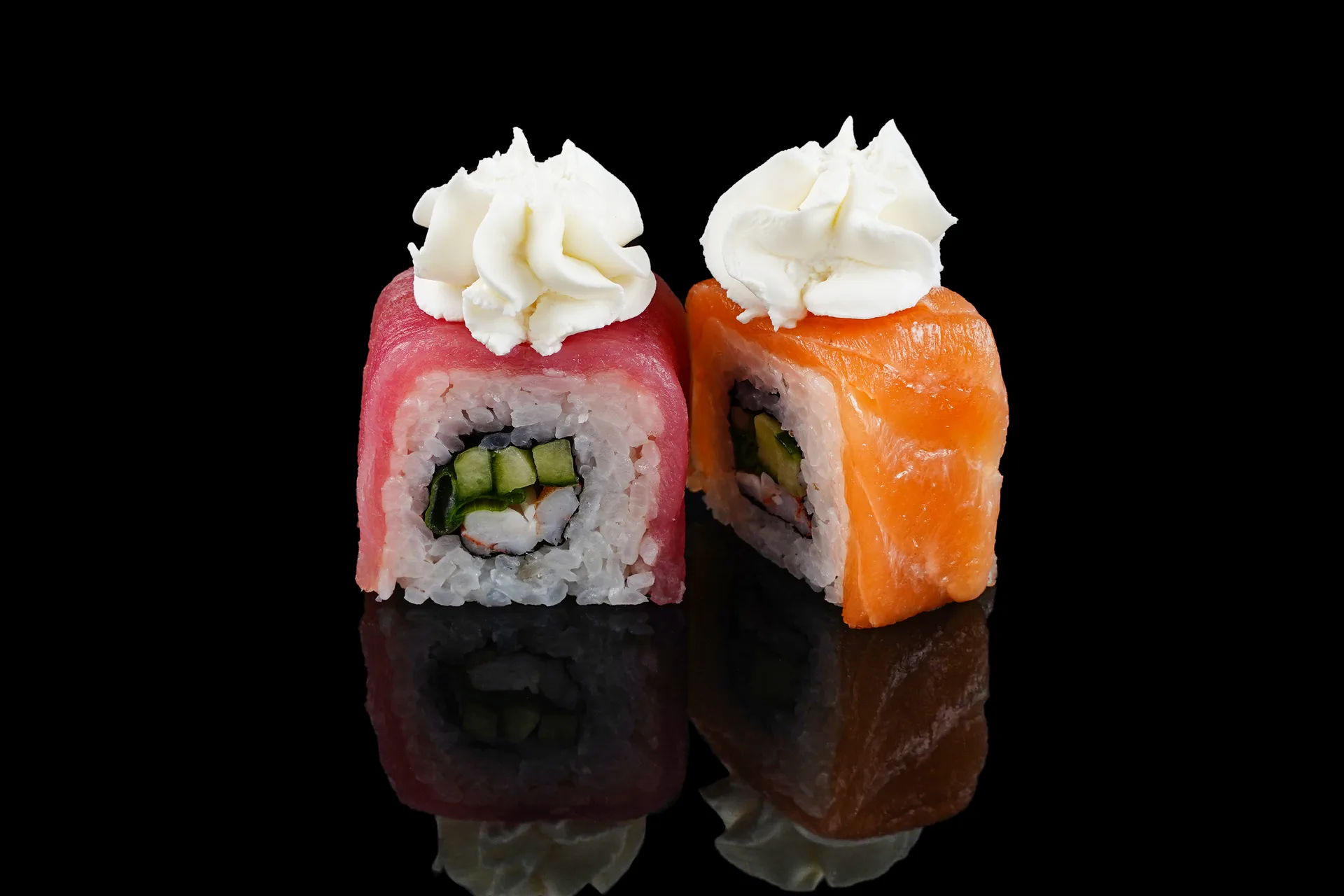 Лосось, тунец, креветка, сыр сливочный, огурец, лук