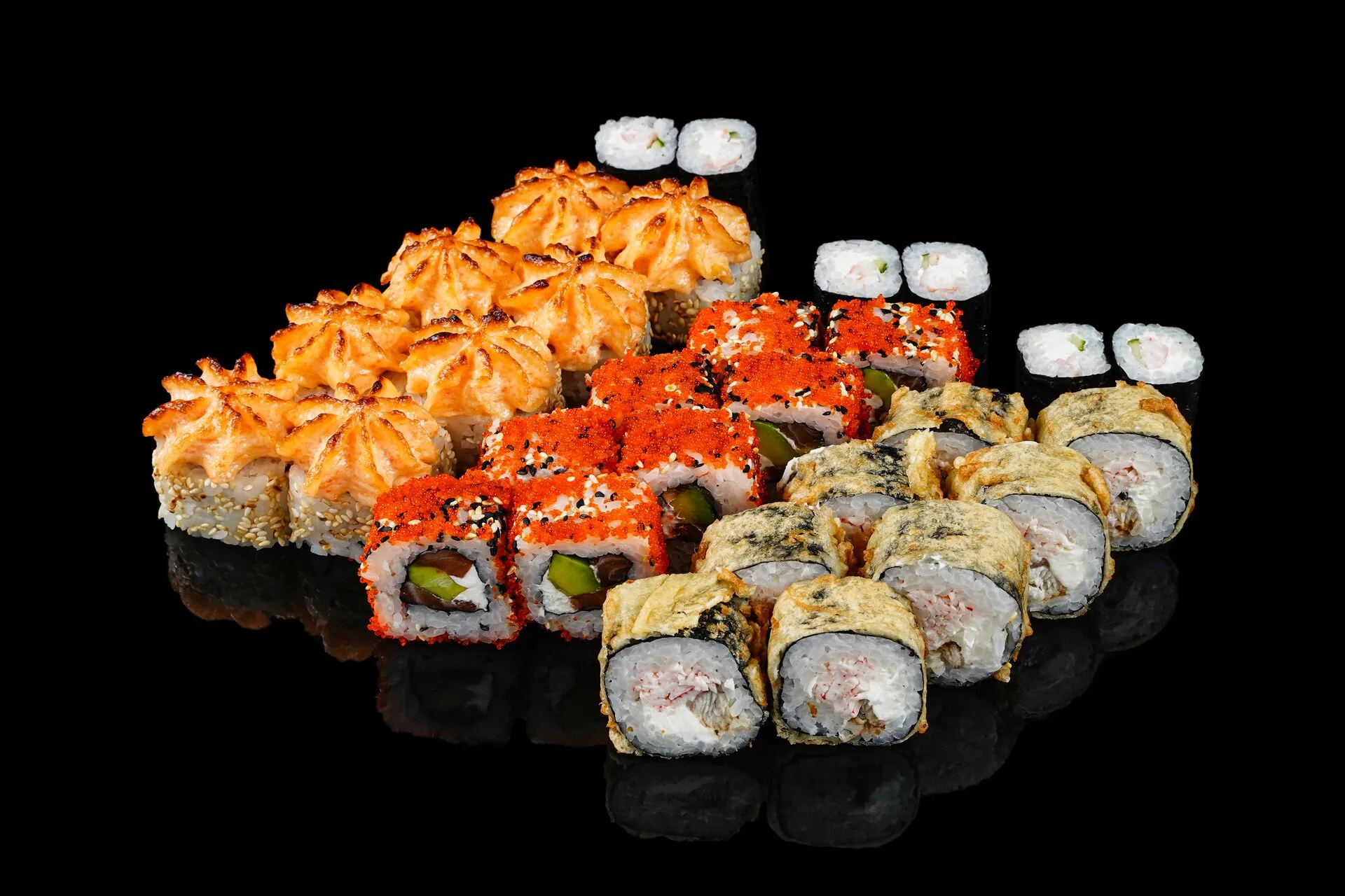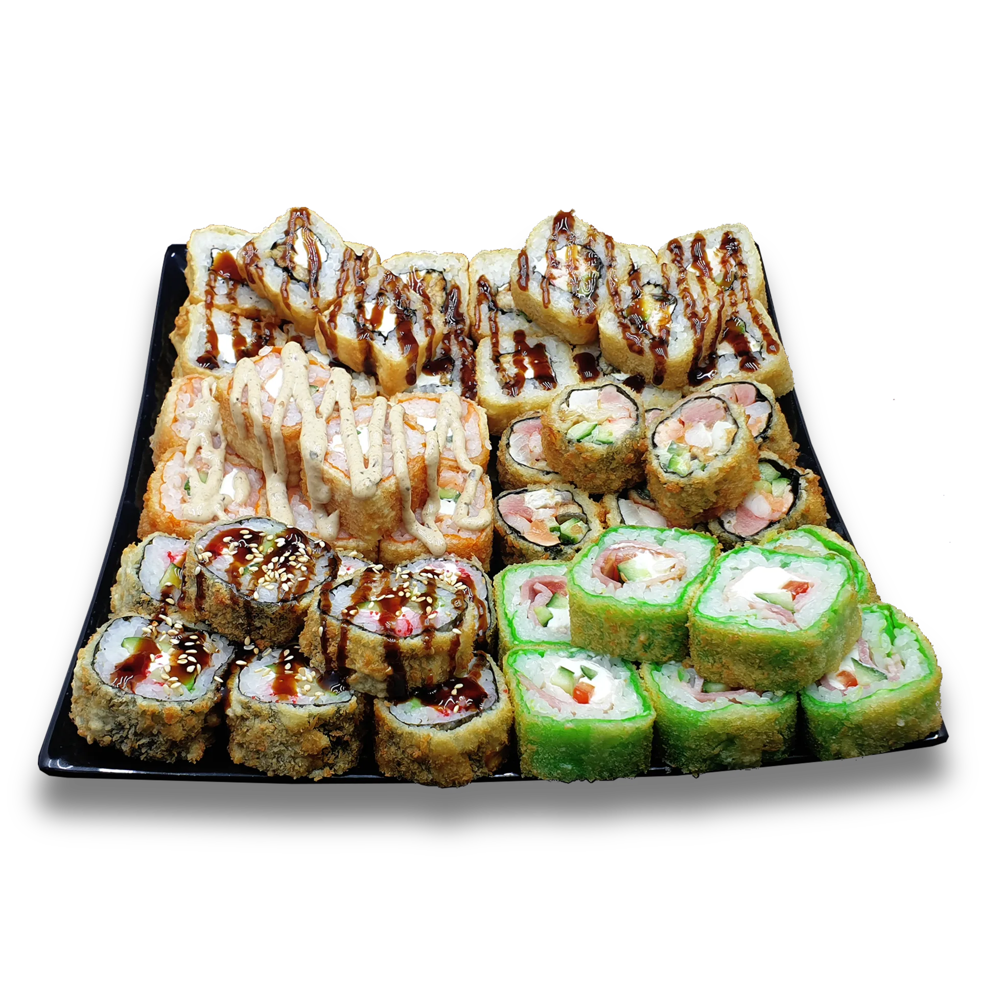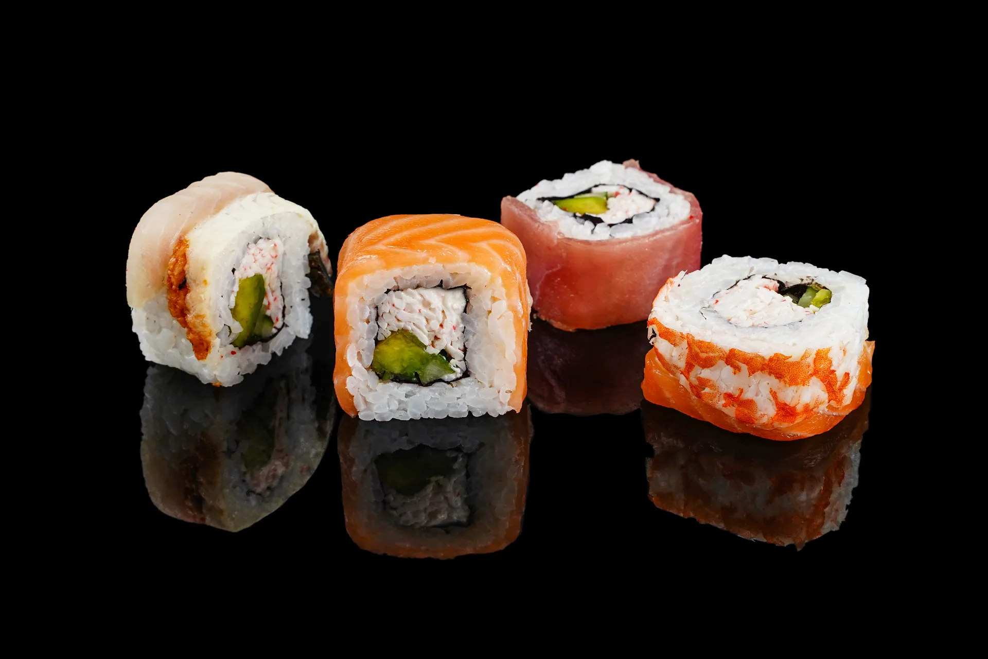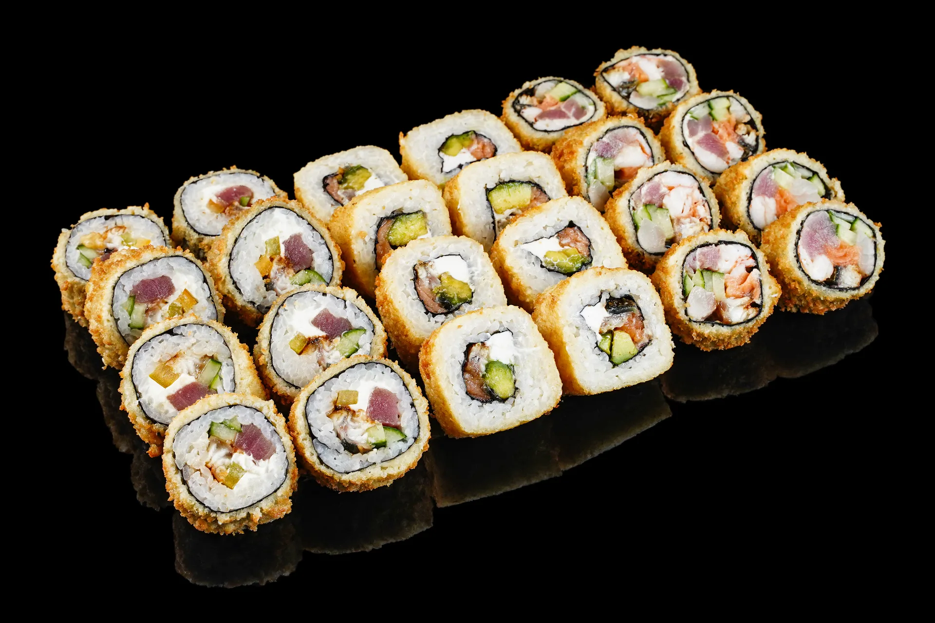 Лосось, тунец, креветка, сыр сливочный, огурец, лук