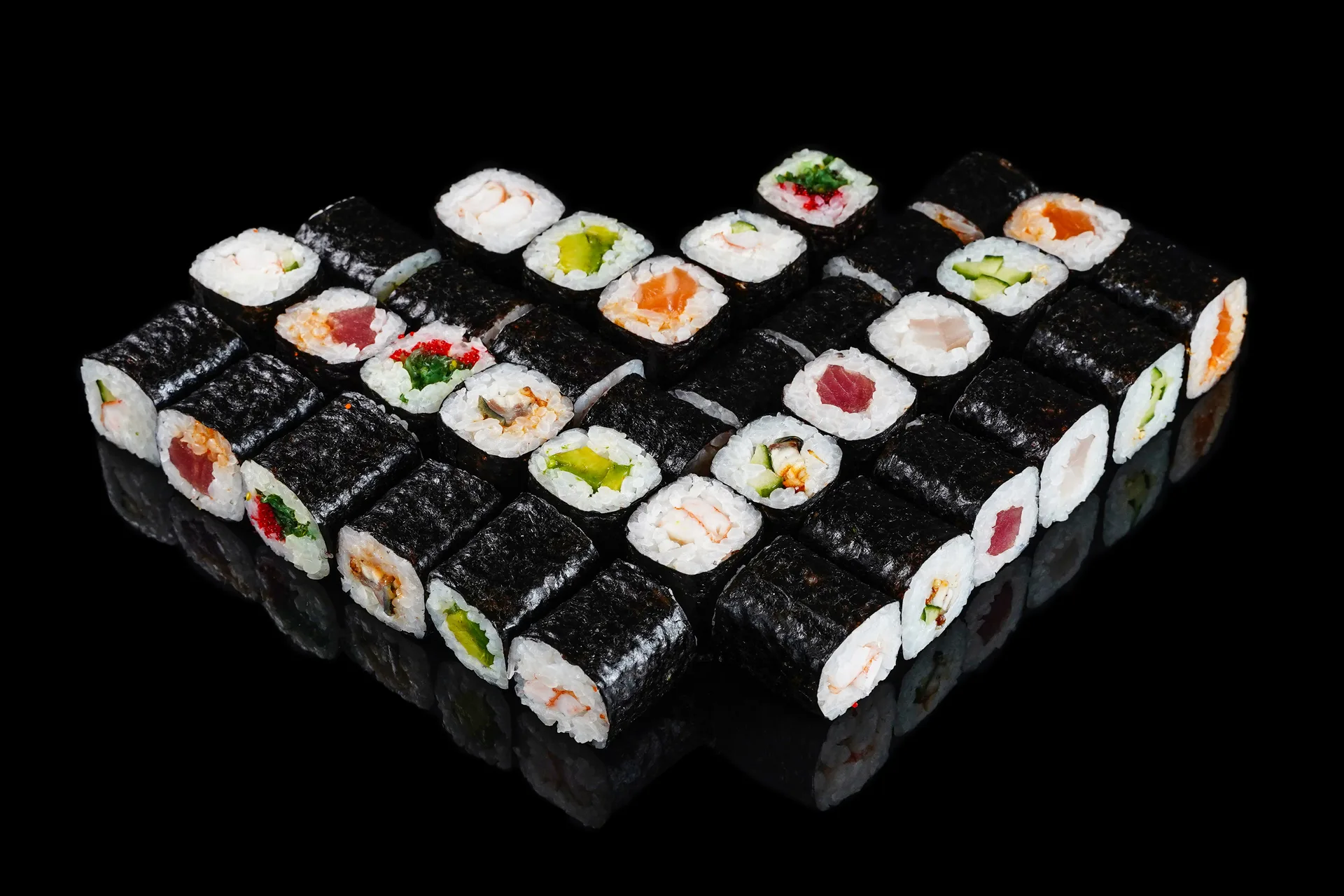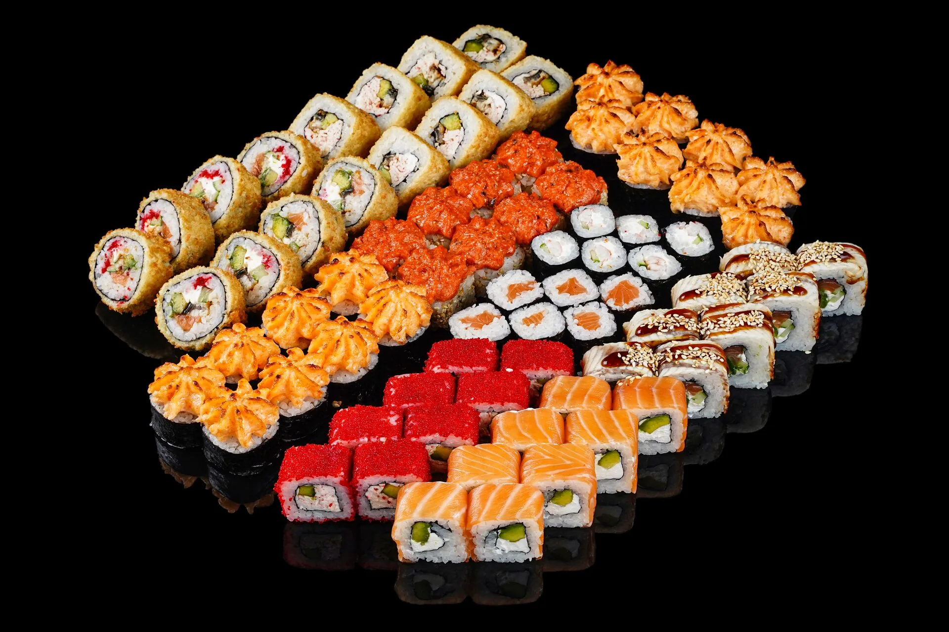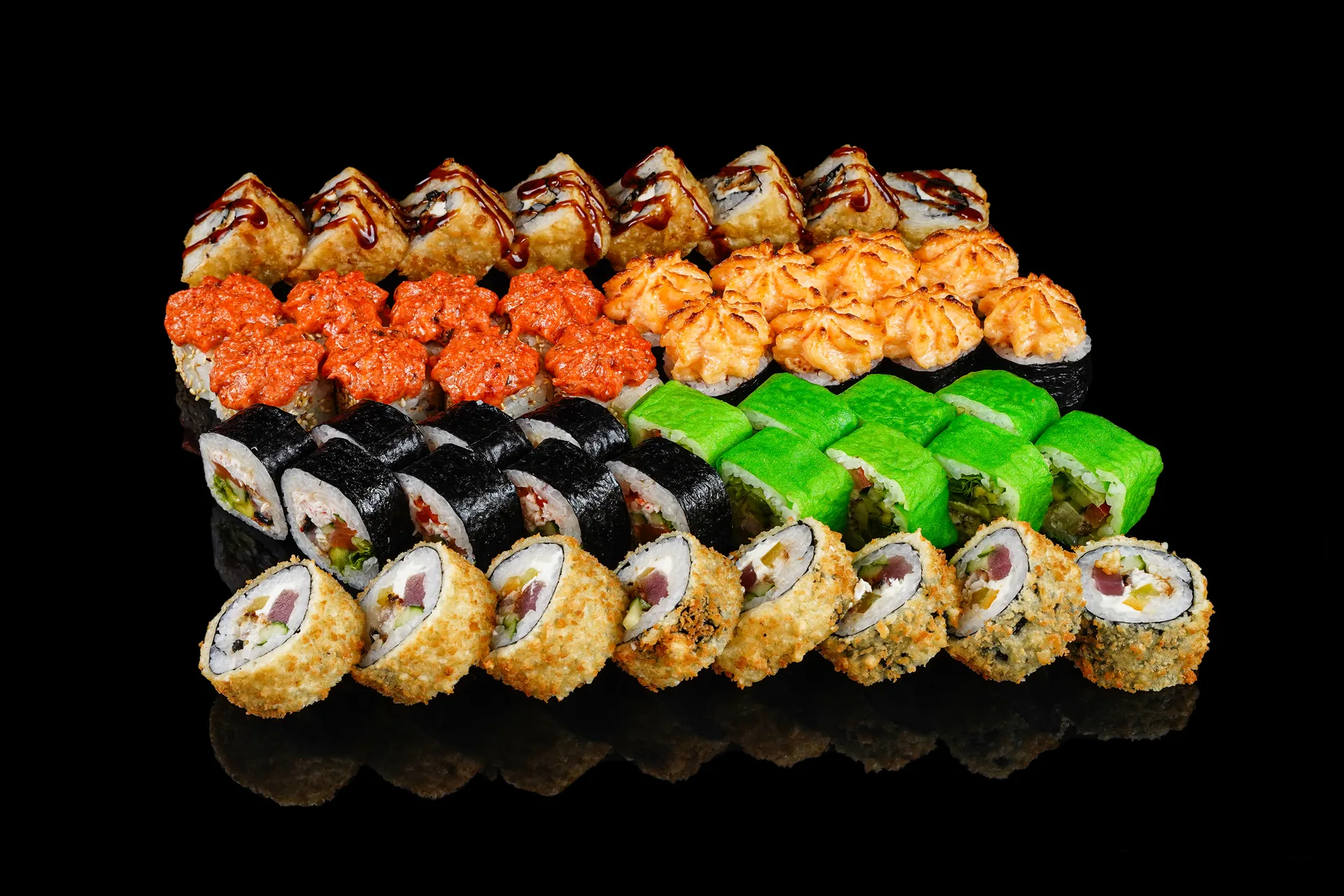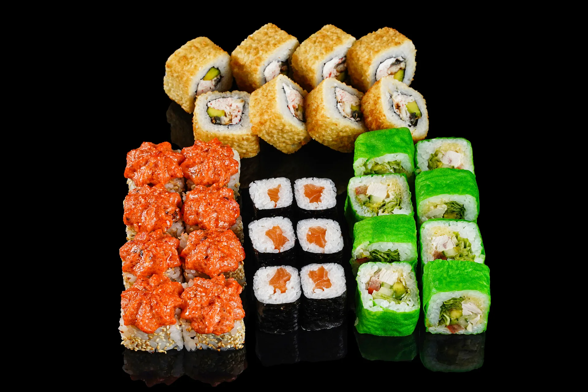 Лосось, тунец, креветка, сыр сливочный, огурец, лук