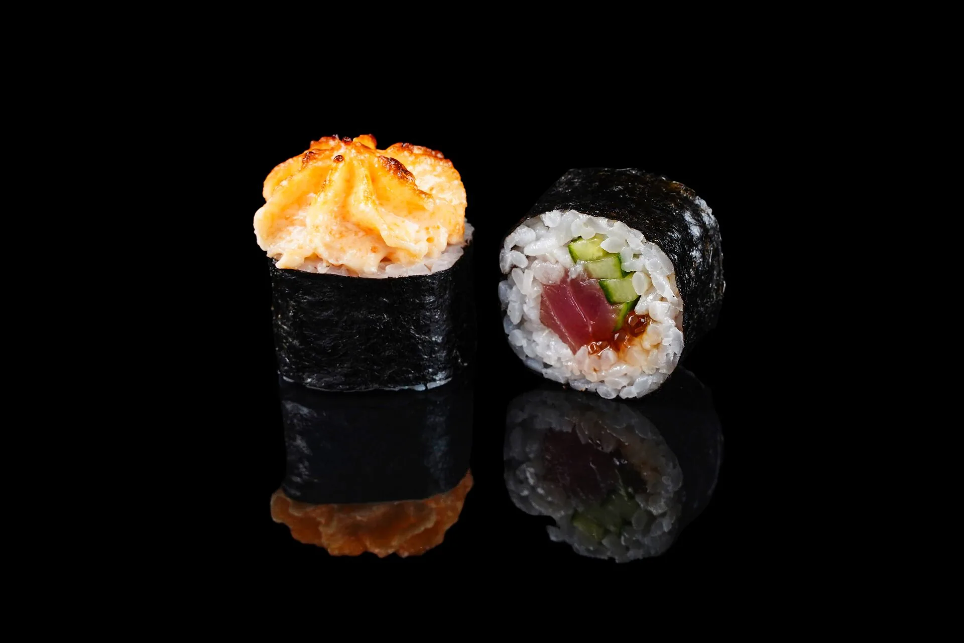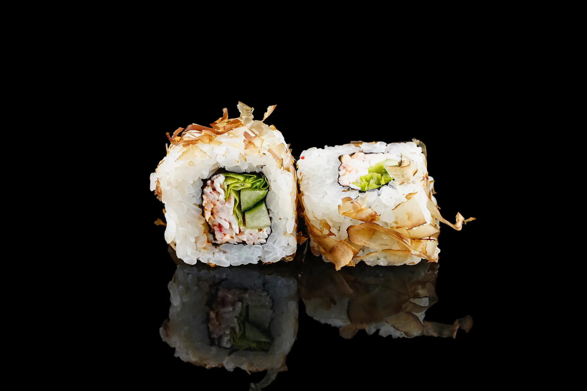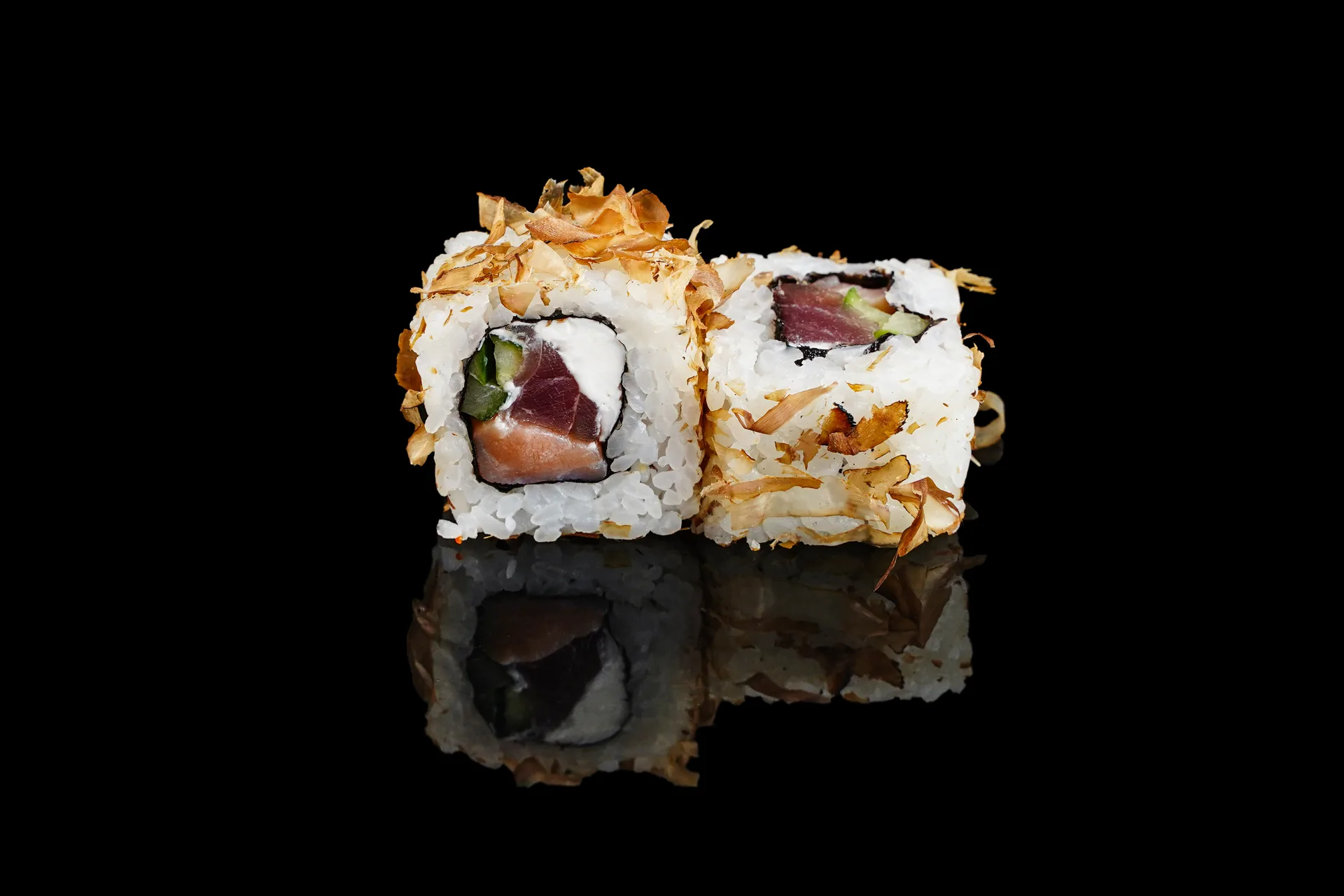 Тунец, огурец, лосось копченый, сыр сливочный, стружка тунца