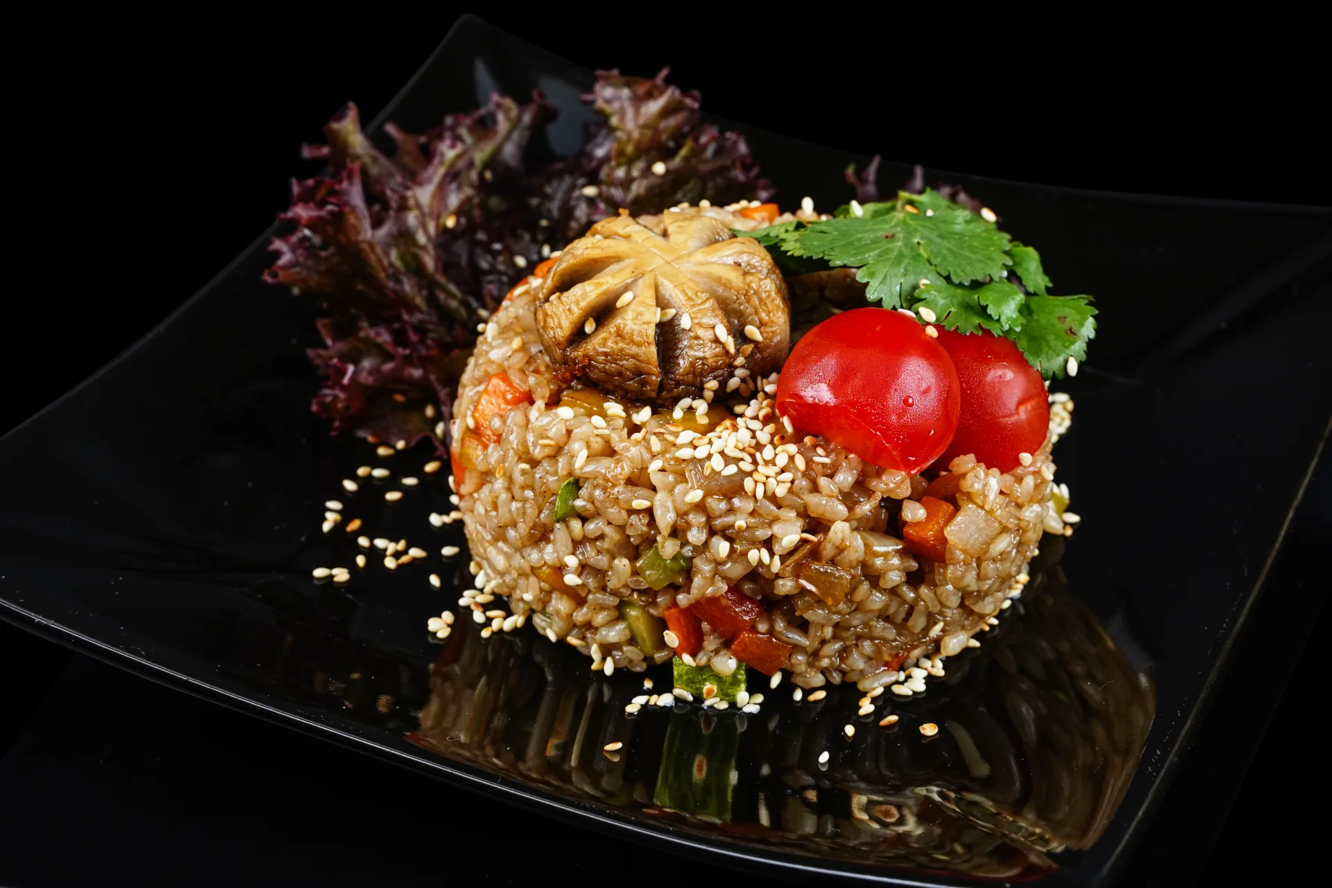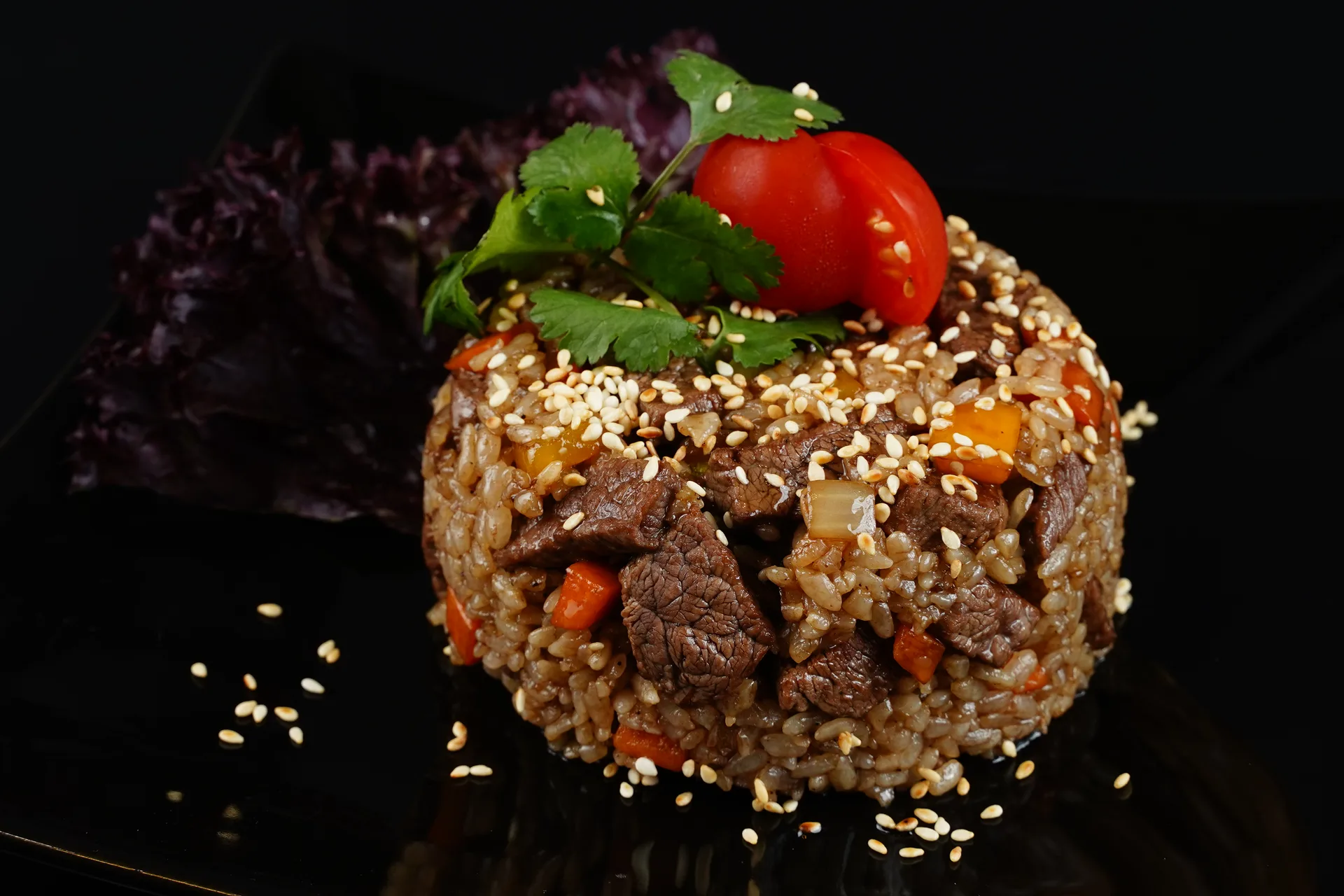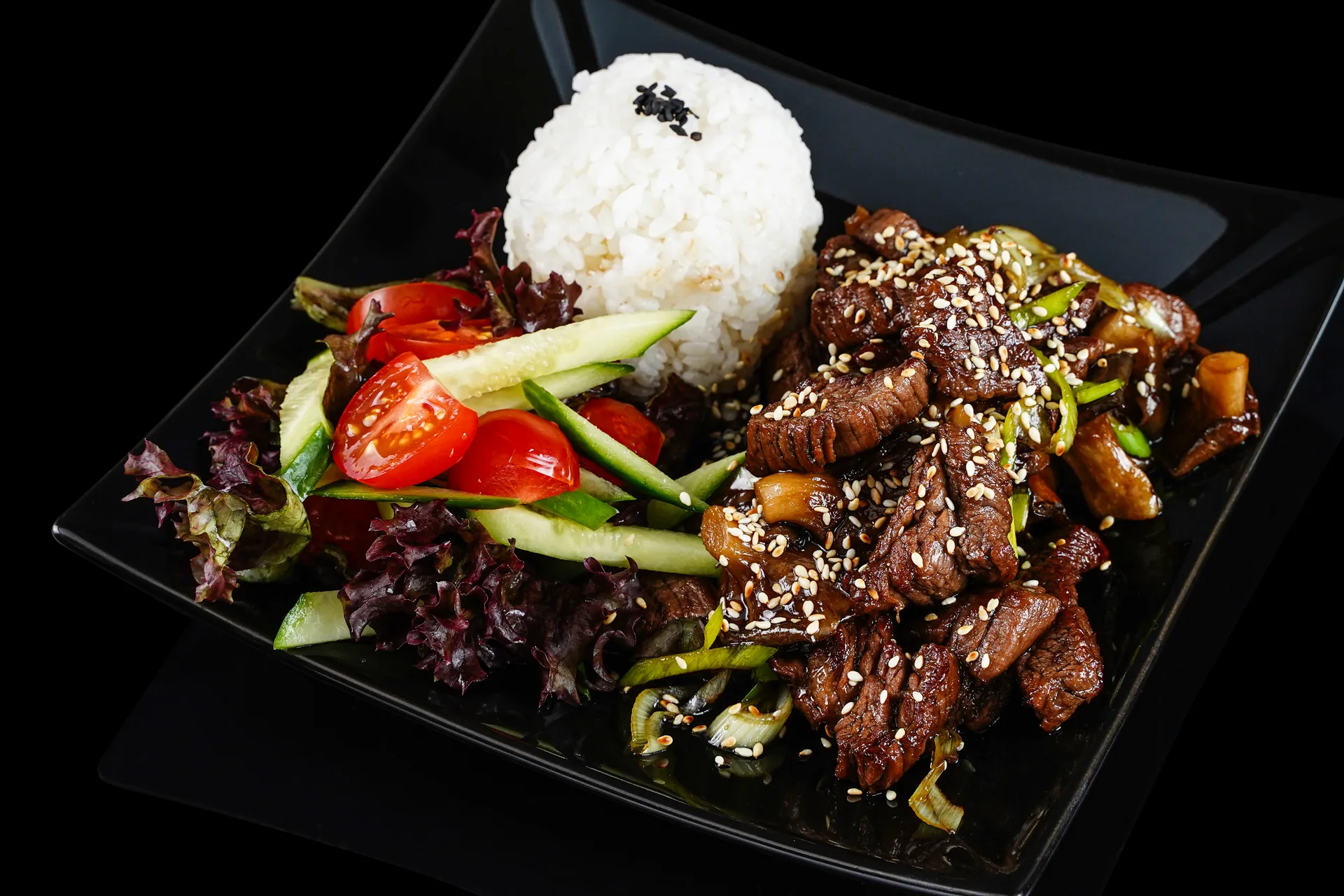 Говяжья вырезка, грибы вешенки, лук-порей, микс салата, рис Гохан, соус Бутто-сёга