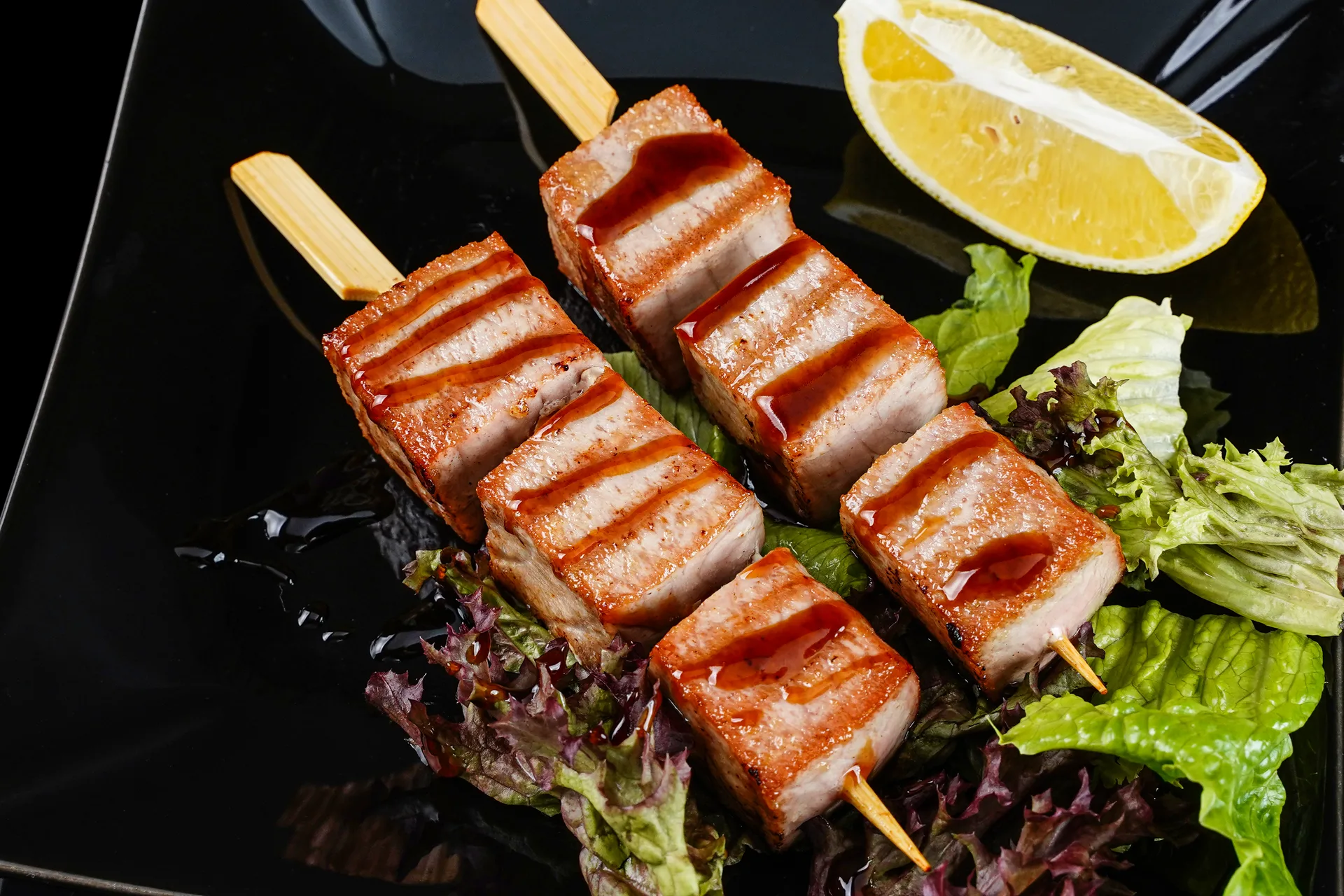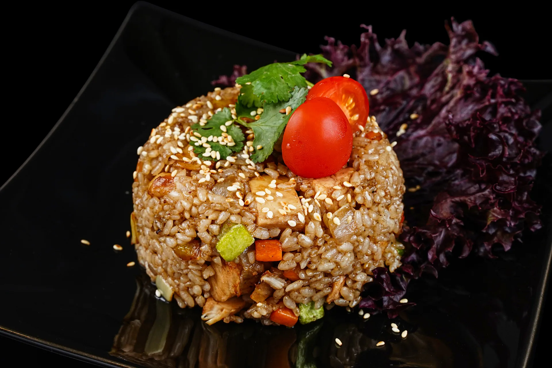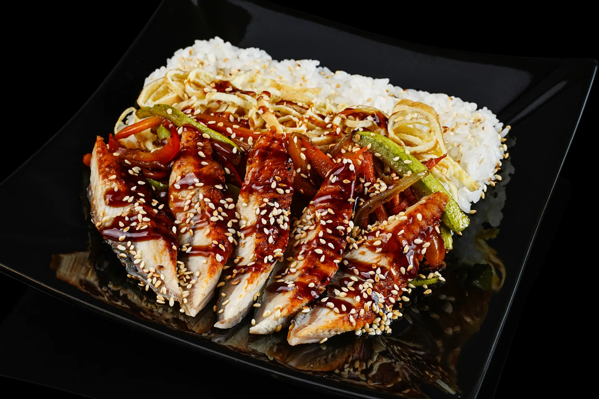 Говяжья вырезка, грибы вешенки, лук-порей, микс салата, рис Гохан, соус Бутто-сёга