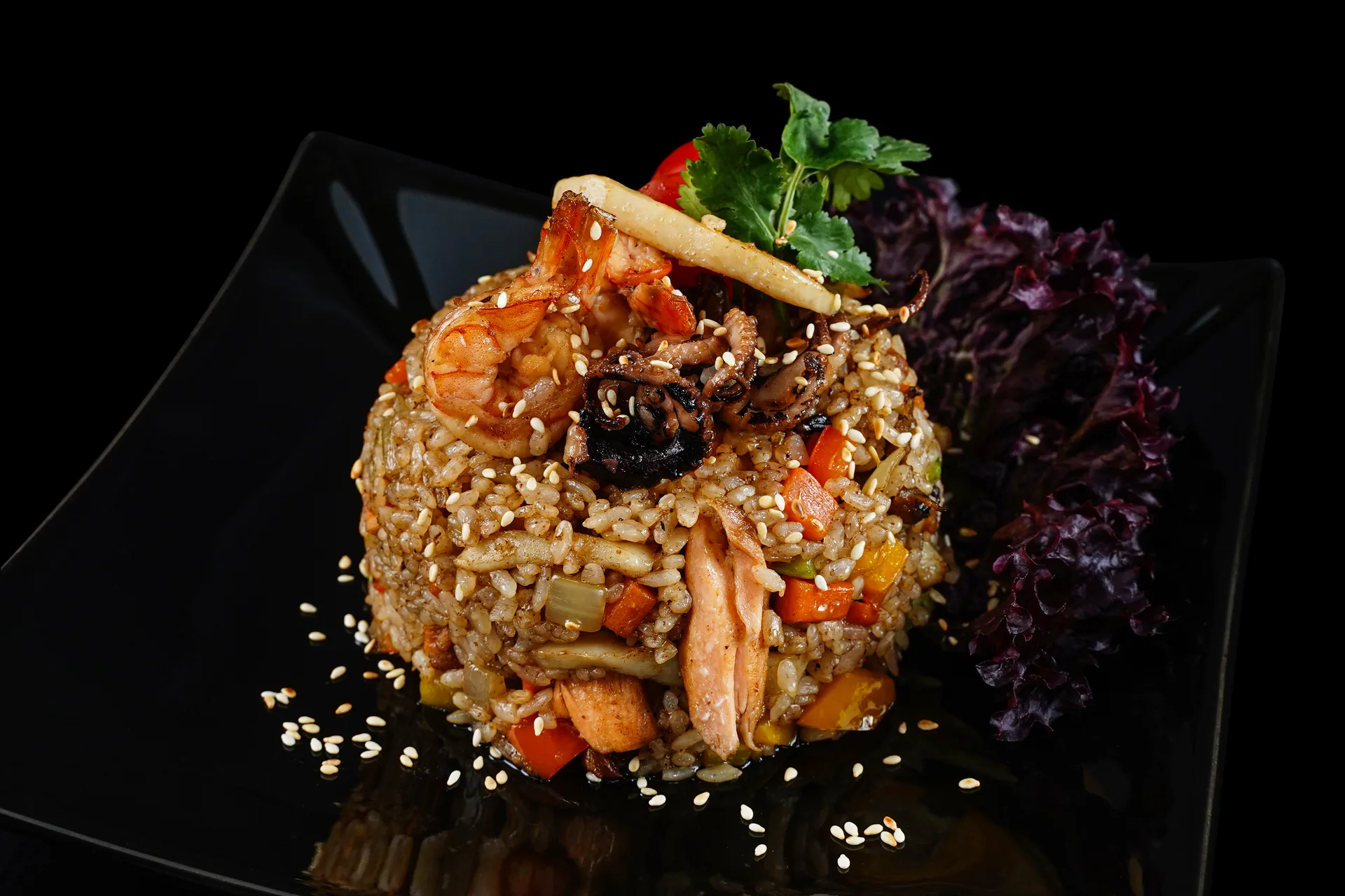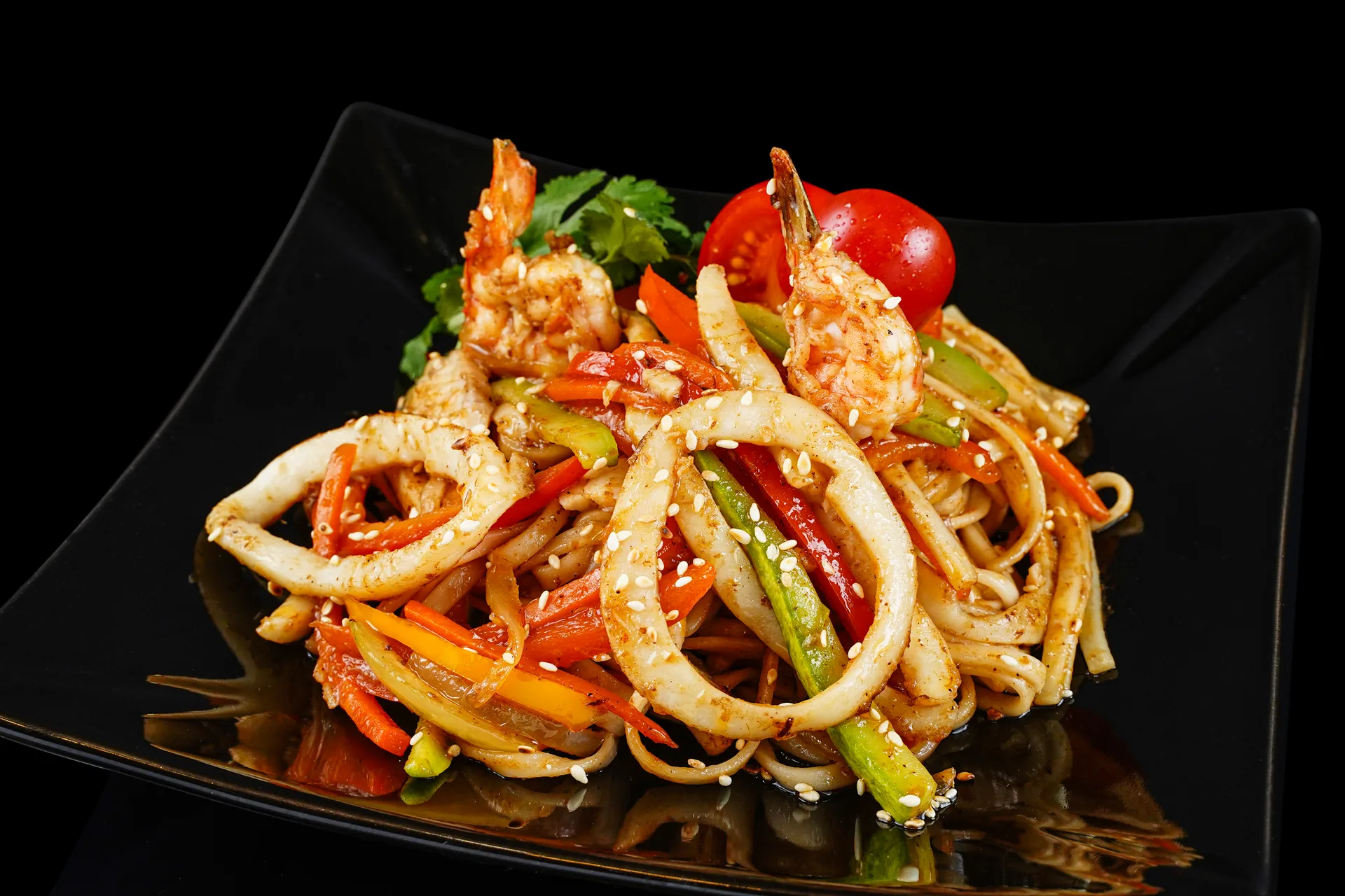 Лапша с морепродуктами и овощами. Лапша на выбор: Удон (пшеничная) Соба (гречневая) Харусаме (рисовая) Овощи: лук, морковь, цукини, кунжут, перец болгарский, кинза