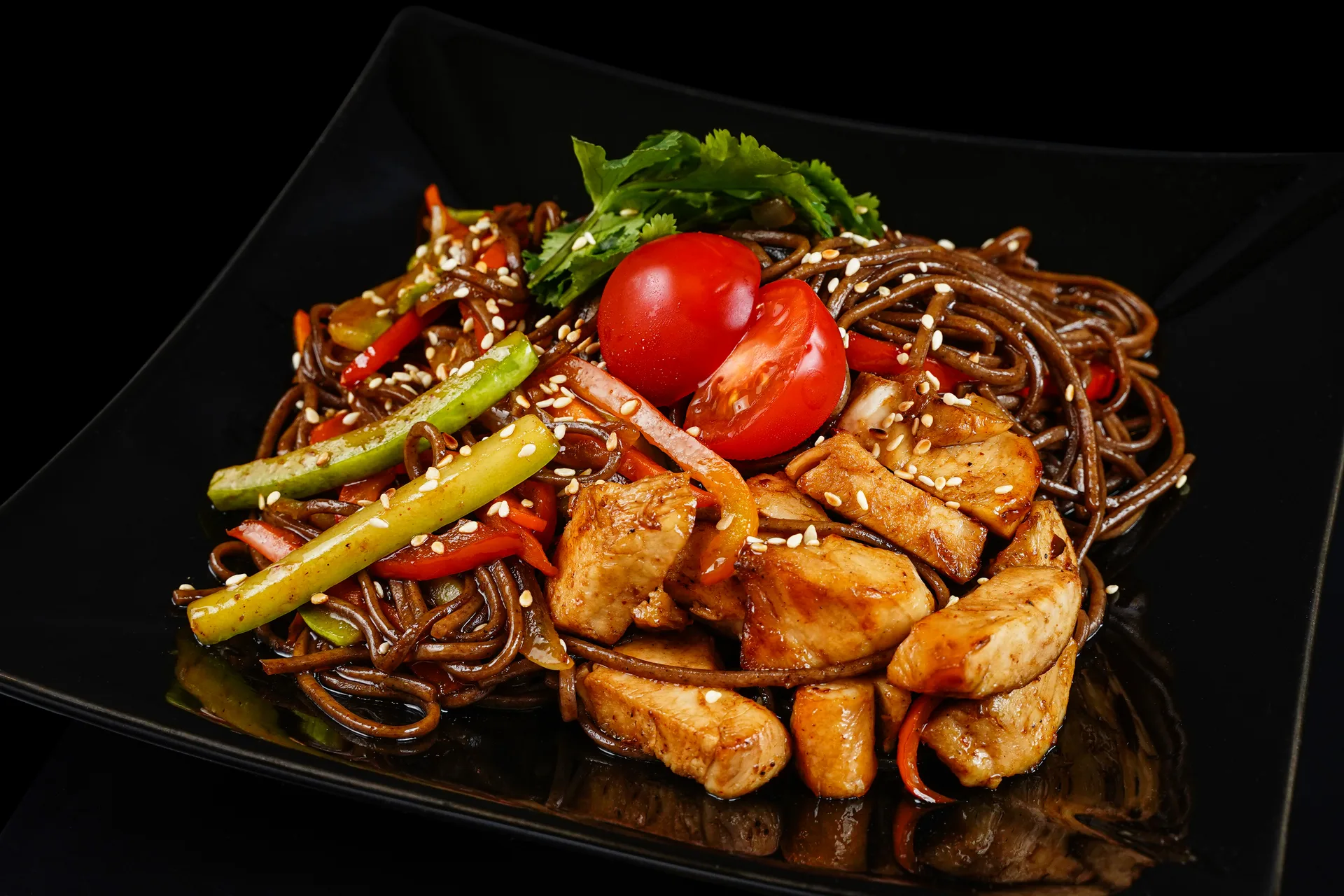 Лапша с курицей и овощами. Лапша на выбор: Удон (пшеничная) Соба (гречневая) Харусаме (рисовая) Овощи: лук, морковь, цукини, кунжут, перец болгарский, кинза