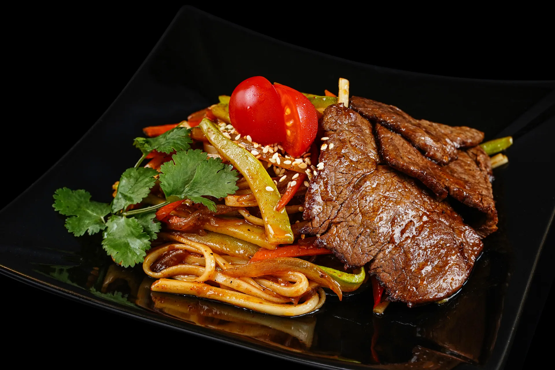 Лапша с говядиной и овощами. Лапша на выбор: Удон (пшеничная) Соба (гречневая) Харусаме (рисовая) Овощи: лук, морковь, цукини, кунжут, перец болгарский, кинза