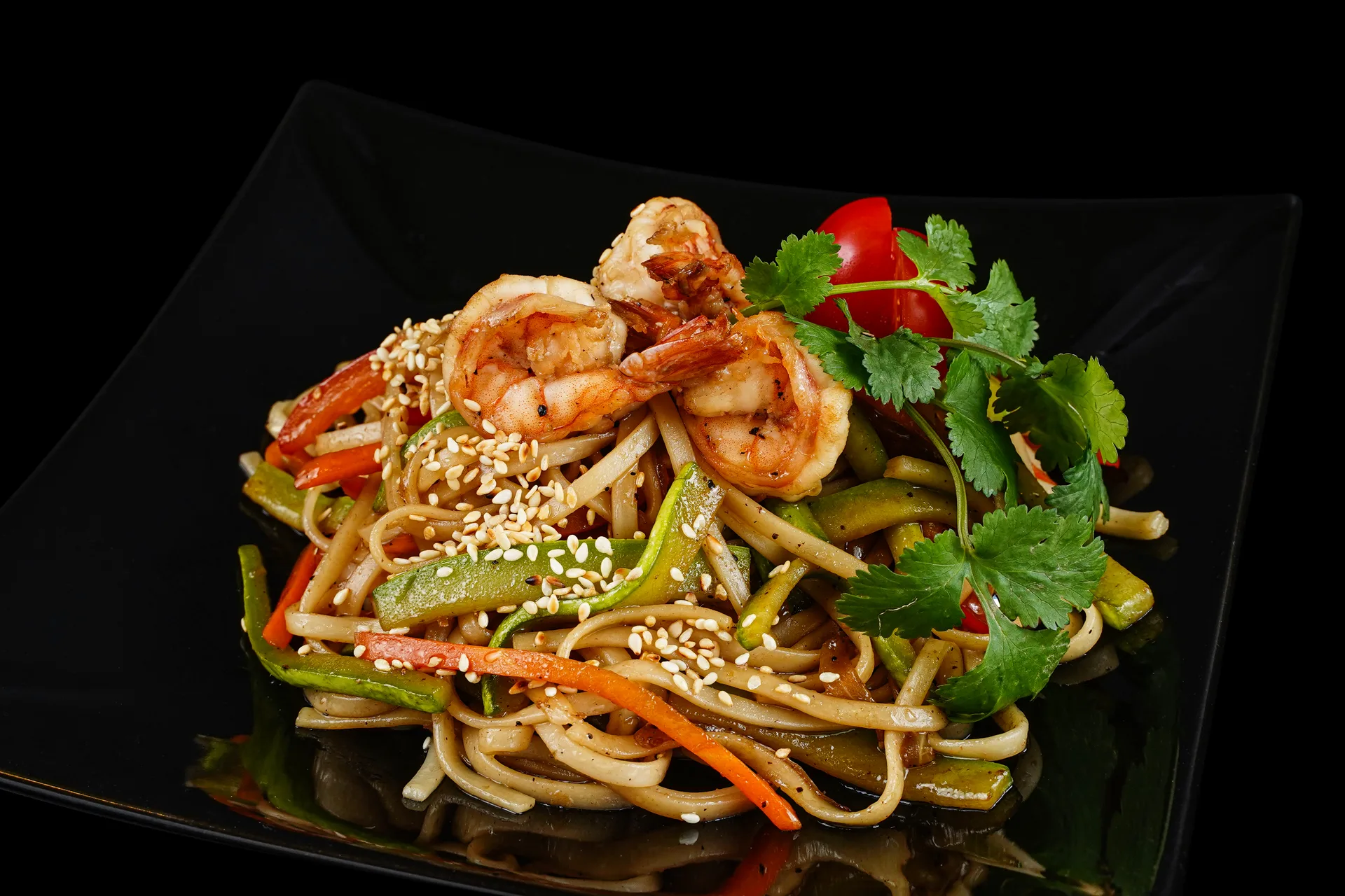 Лапша с креветками и овощами. Лапша на выбор: Удон (пшеничная) Соба (гречневая) Харусаме (рисовая) Овощи: лук, морковь, цукини, кунжут, перец болгарский, кинза