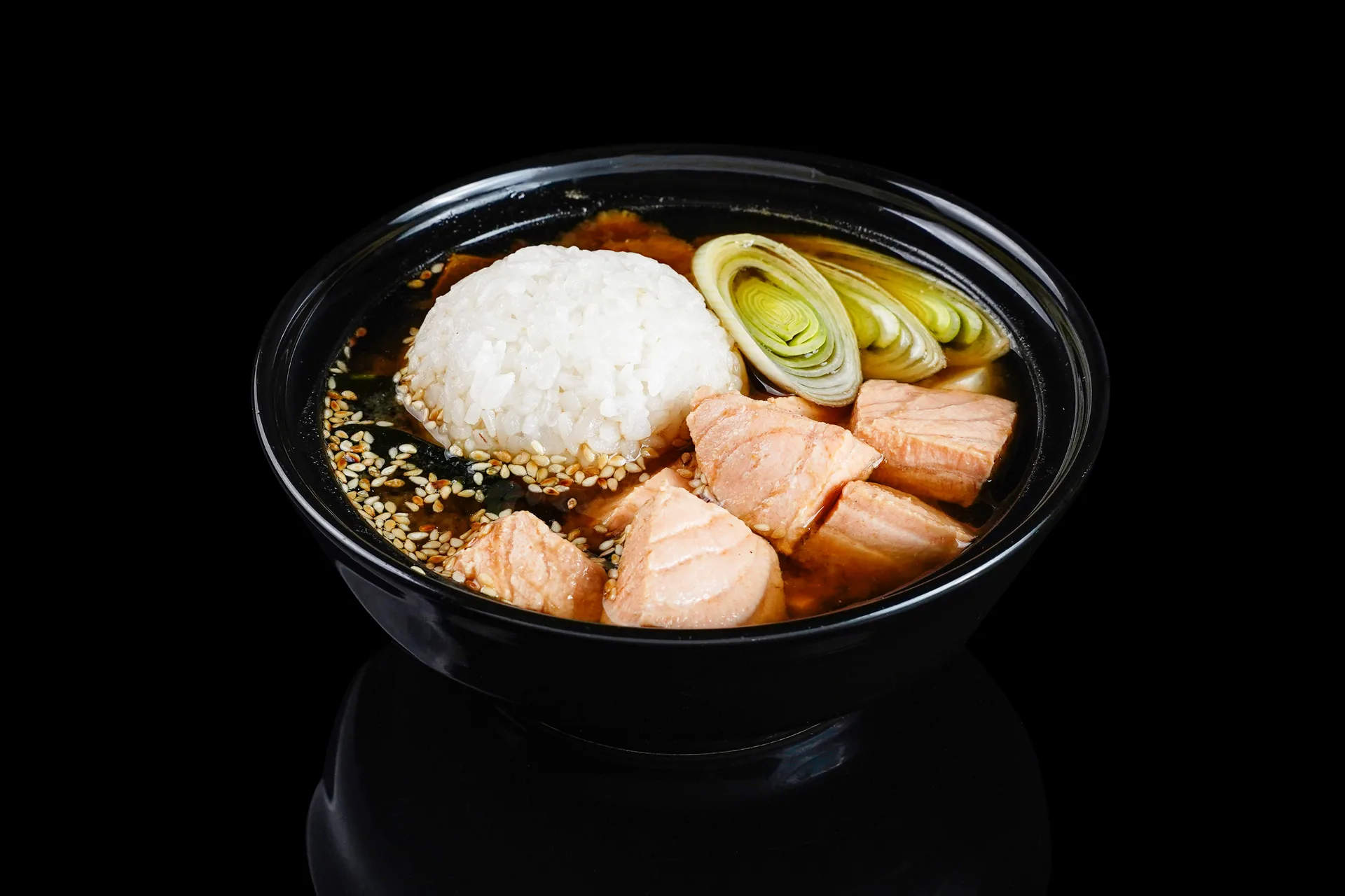 Суп на рыбном бульоне с пастой Мисо, филе лосося, сыр Тофу, грибы Намеко, водоросли Вакаме, рис