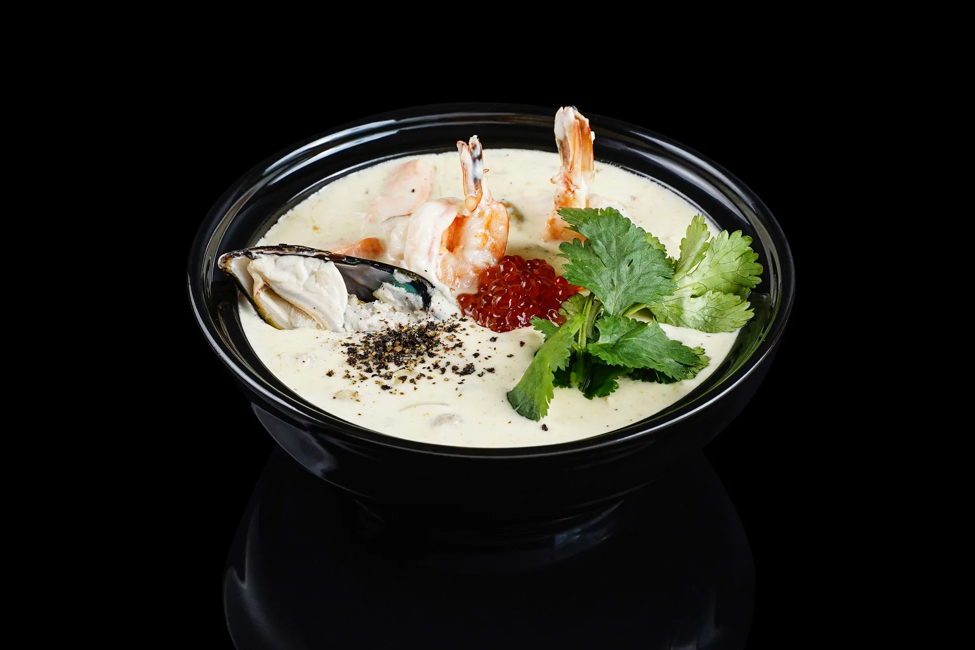 Креветки тигровые, креветки коктейльные, лосось, лук репчатый, мидии, сливки, икра лосося, мидия "киви"