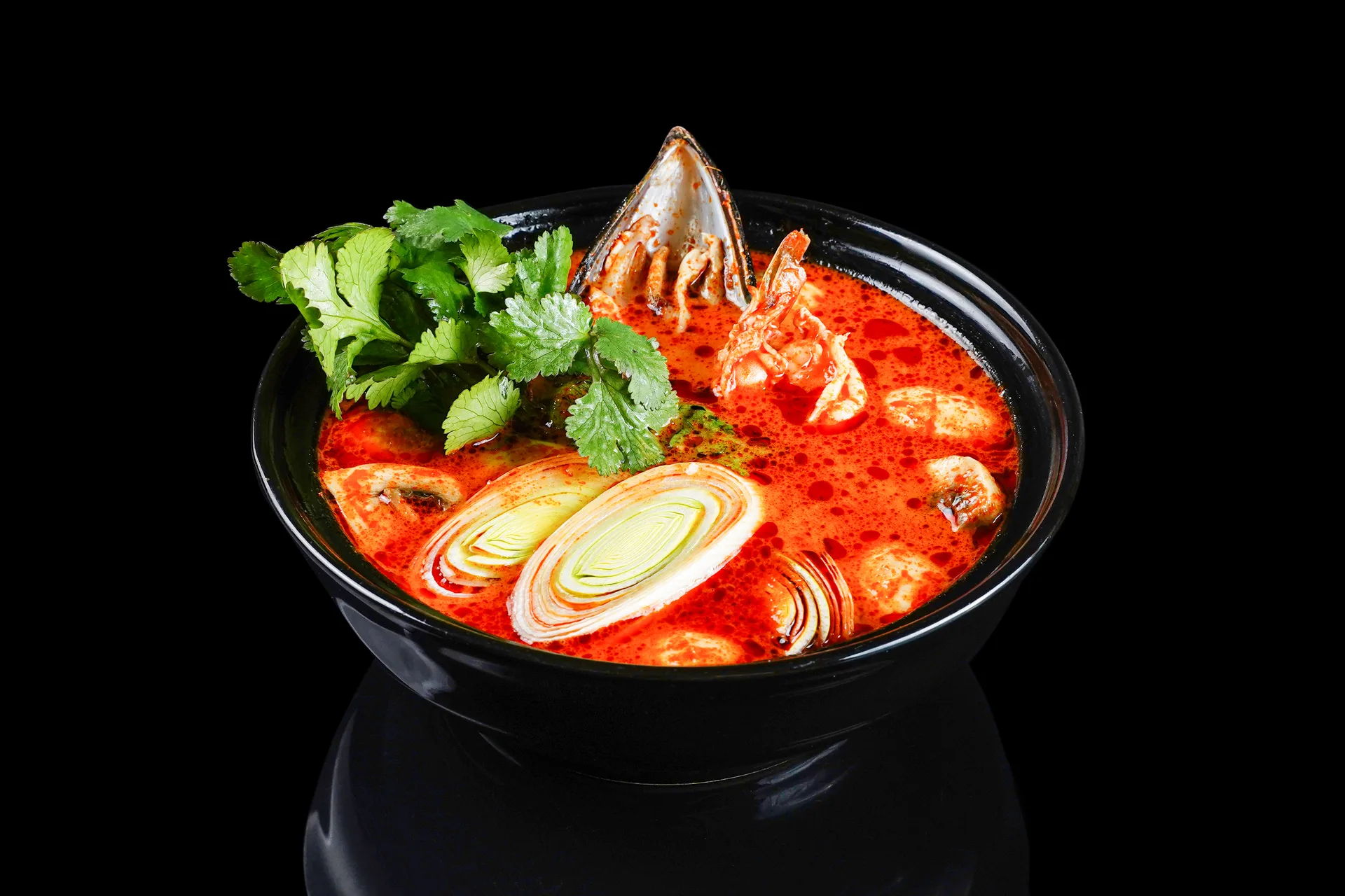 Острый суп с тигровыми креветками, мидией и грибами шампиньонами. Подаётся с рисом.