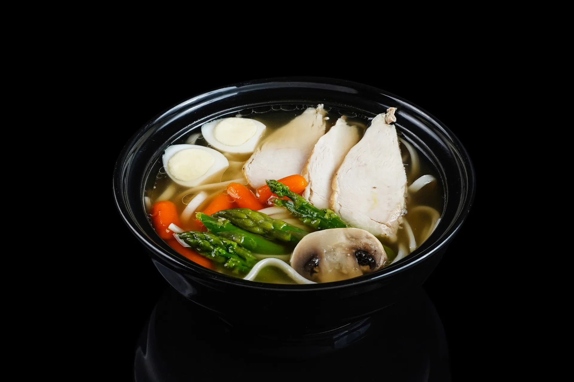 Куриный бульон, куриное филе, лапша Удон, спаржа, морковь, шампиньоны, яйцо перепелиное