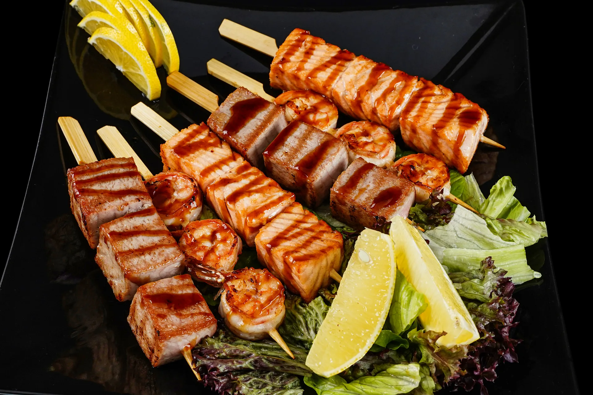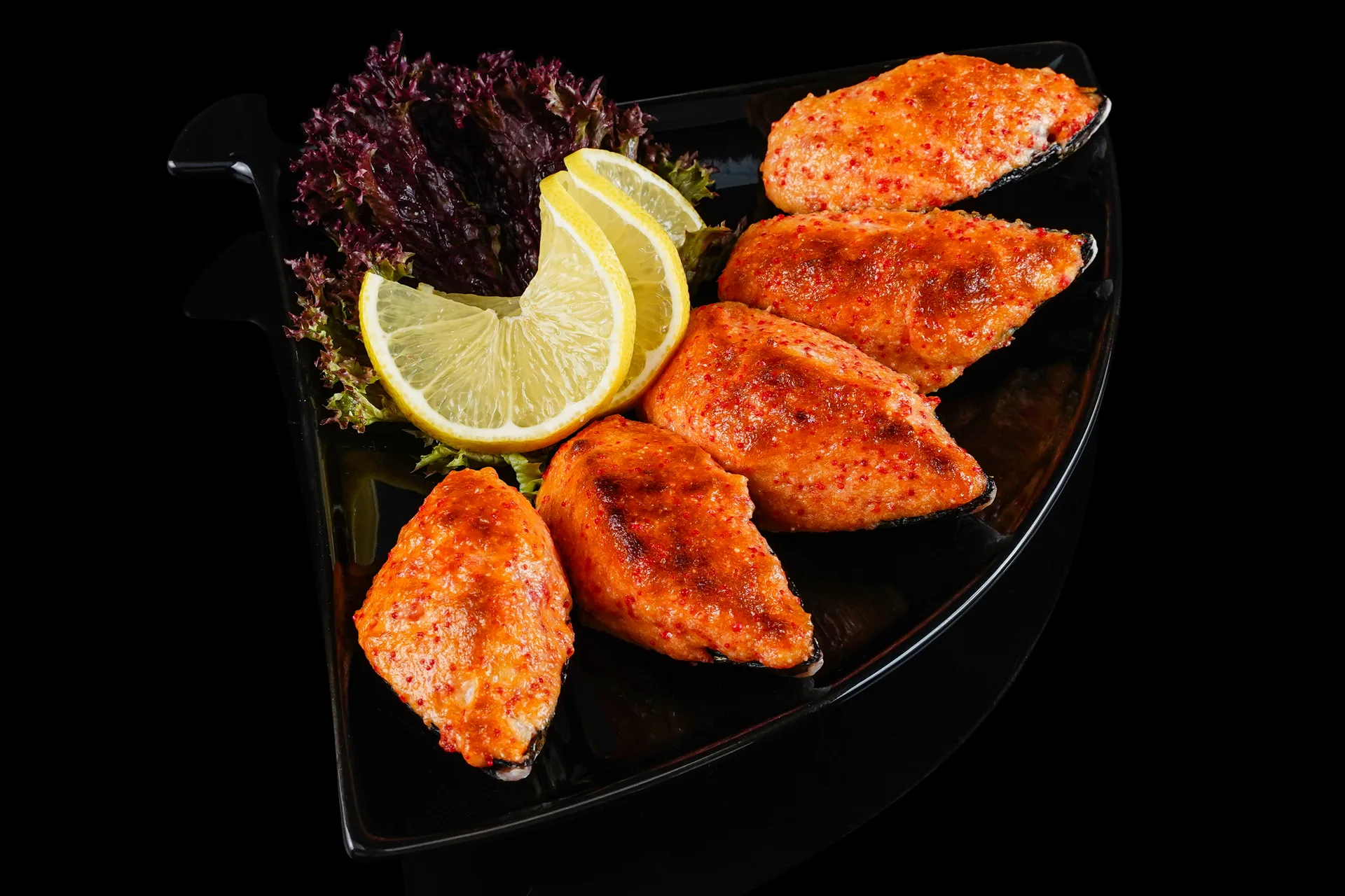Мидии, креветки коктейльные, соус Яки, икра Тобико