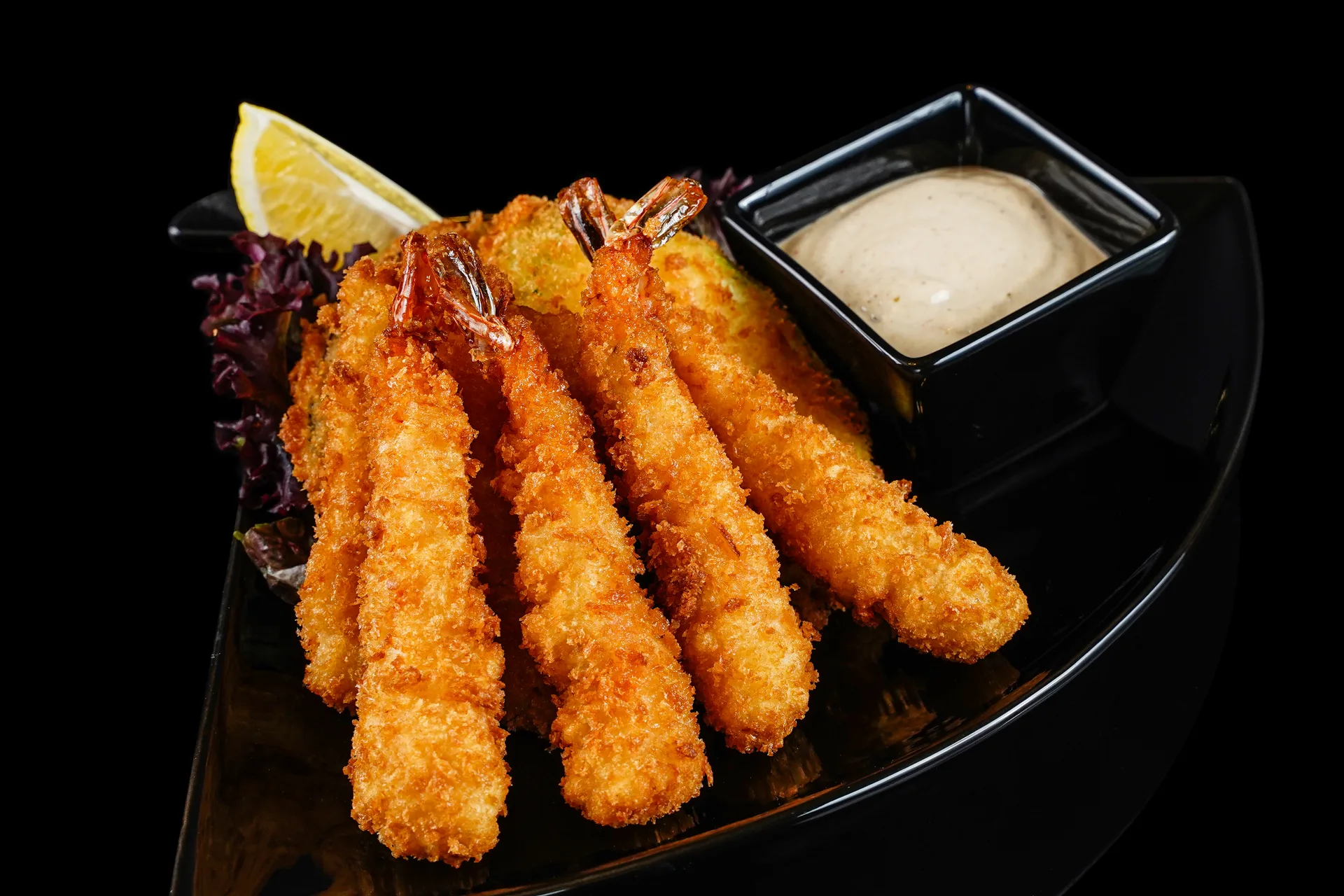 Темпура из тигровых креветок с овощами. Подается с соусом Тар-тар.