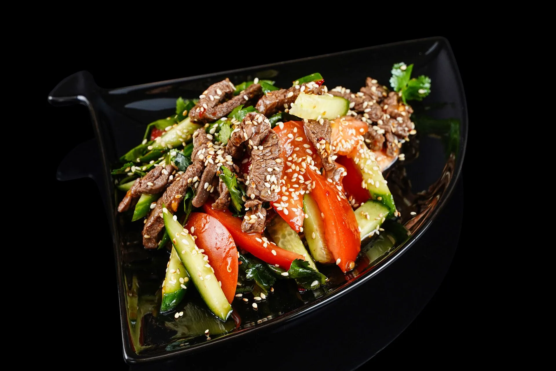Говяжья вырезка, огурец, кунжут, помидор с кинзой в тайском соусе