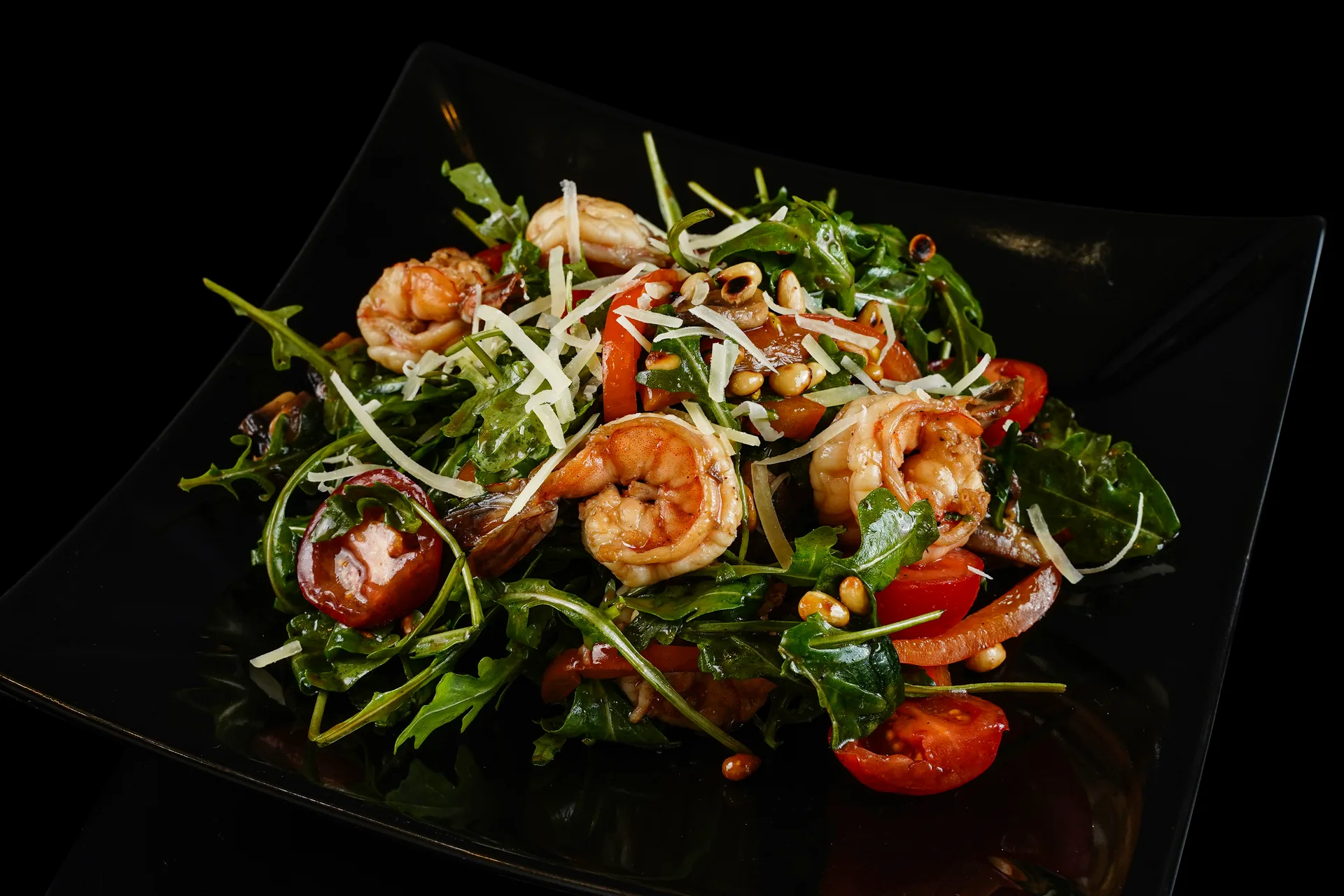 Салат Руккола, жареный болгарский перец, шампиньоны жареные, лимон, соевый соус, сыр Пармезан, кедровые орехи, Черри, креветки тигровые