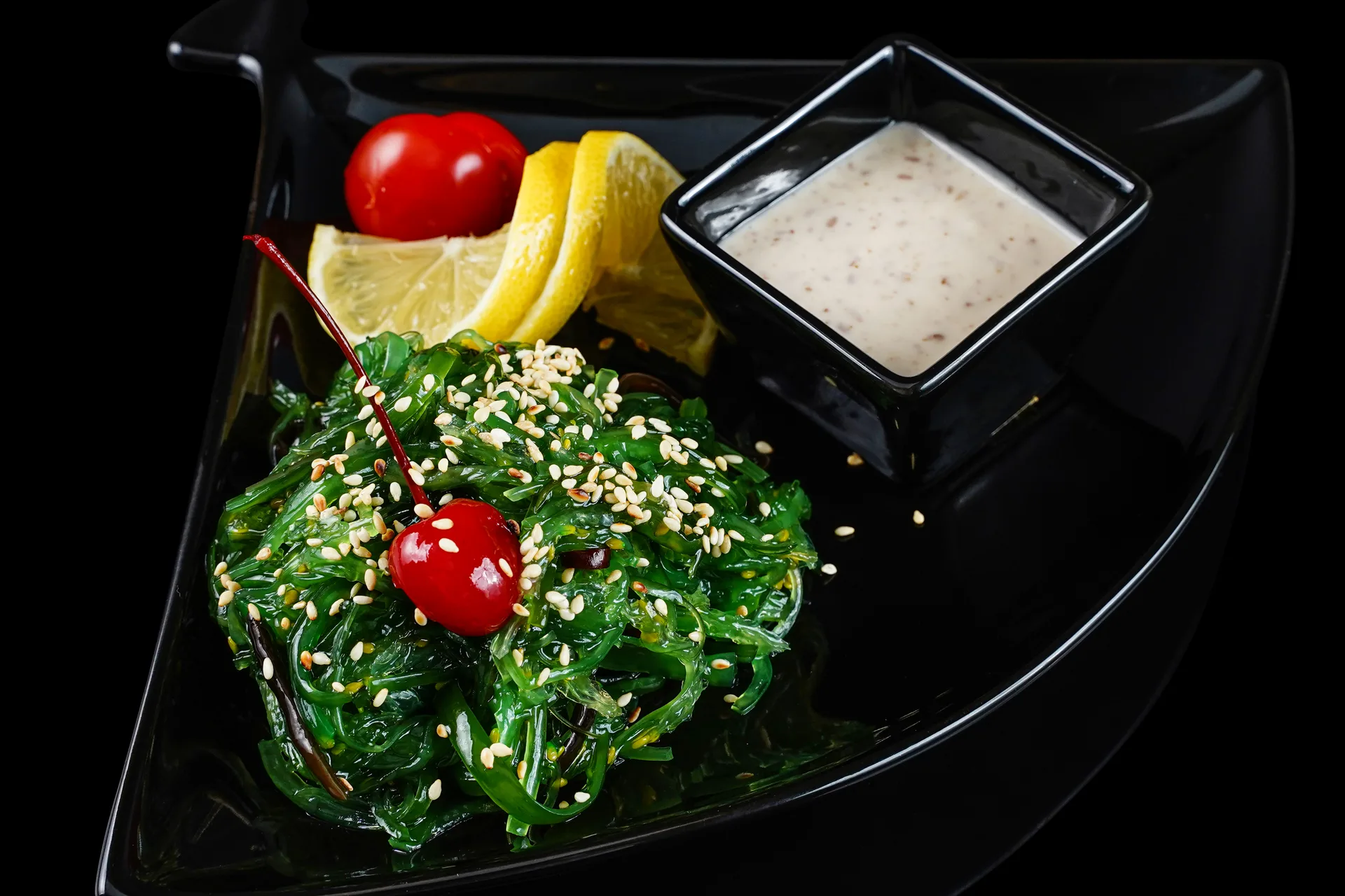 Маринованные водоросли, соус ореховый, кунжут, лимон